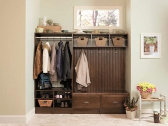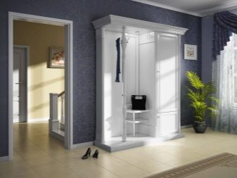 Diese Art von Zimmer passt ein eckiges Modell eines Flurfachs mit einem offenen Seitenständer, Poller und einem einfachen Kleiderbügel. Um nicht darüber nachzudenken, wo ein Spiegel Platz findet, ist es besser, Spiegeltüren für den Schrank zu machen. Solch ein Schrank sieht kompakt aus, aber in der Tat eine sehr geräumige Option.