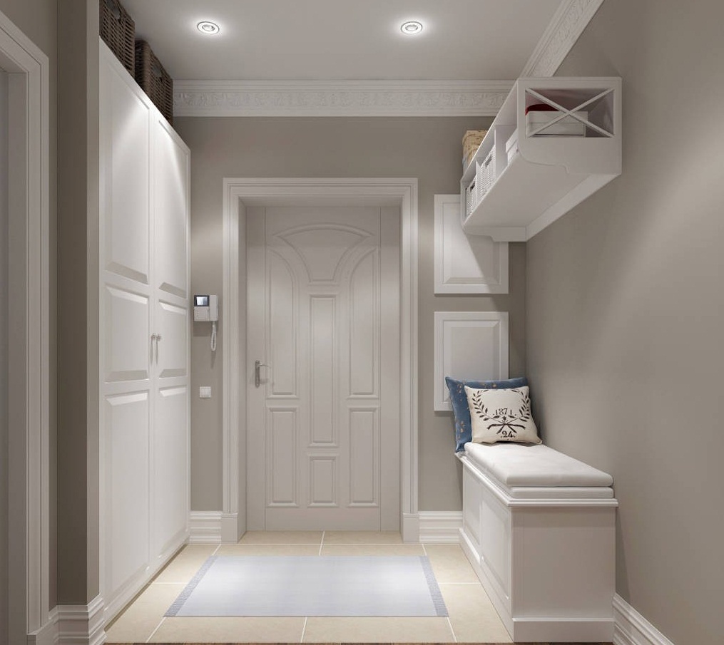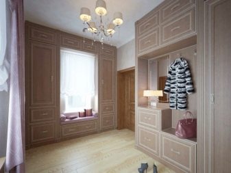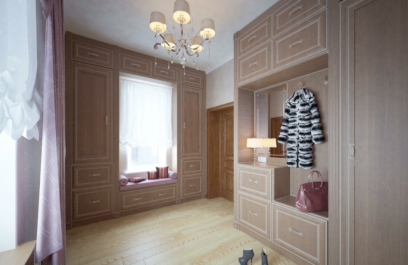 Dieser Typ geht von einer klassischen Garderobe mit Flügeltüren aus. Der Stil des Raumes wird sich etwas ändern, aber die Funktionalität wird nicht leiden. Wenn die Höhe der Decke erlaubt, können Sie Schränke, Mezzanine installieren.
