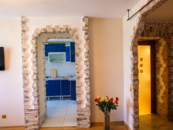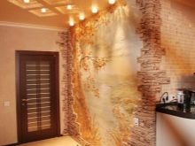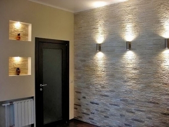 Natürlich hat der dekorative Stein eine stilvolle und schöne Optik. Damit es Ausdruckskraft und ungewöhnliche Konturen erhält, ist es wichtig, dem Material bei der Gestaltung des Designs eine kleine Note zu geben. Zum Beispiel wird die Verlegung zu einem Volumen, wenn es nicht mit einer Kontrastkontur versehen wird, und Punktlampen werden helfen, die Auskleidung wirksam zu betonen. Sie werden die Beleuchtung richtig verteilen und das Dekor an den richtigen Stellen betonen, besonders wichtig ist es, sich im "Chruschtschow" zu bewerben.