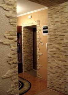 - Künstliches Material es wird viel häufiger in der Gestaltung von Fluren verwendet, da es Standardformen hat, Temperaturabfälle toleriert, keine Angst vor Feuchtigkeit und Schimmel hat und leicht zu reinigen ist. Darüber hinaus ist es im Preis erhältlich. Dekorative Produkte werden in ungewöhnlichen Farben und Texturen, ungewöhnlichen natürlichen Materialien präsentiert, so dass sie das ursprüngliche Mauerwerk unter einen Ziegelstein oder Schotter legen können. Oft wird ein künstliches Material in Form einer Fliese hergestellt, die wie Schiefer oder Marmor aussieht.