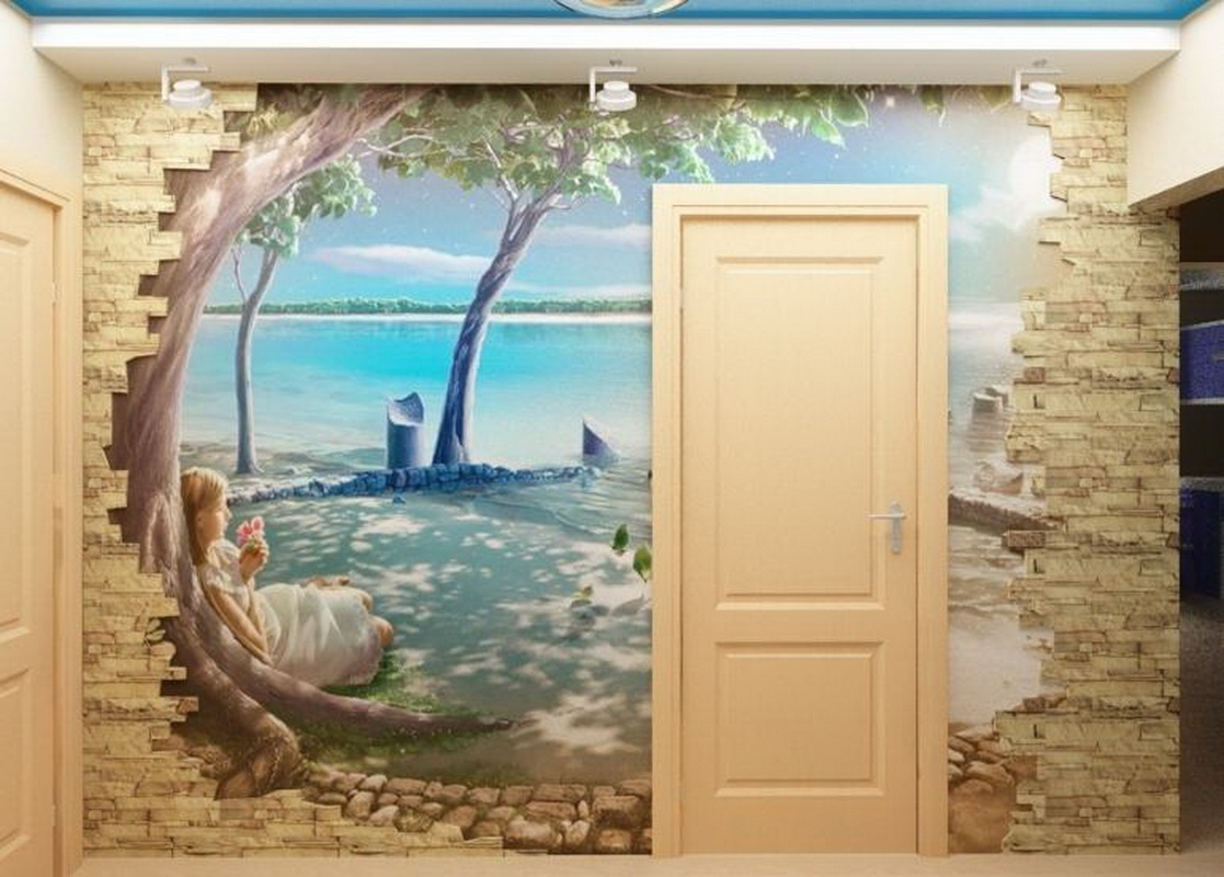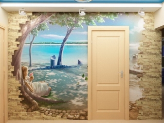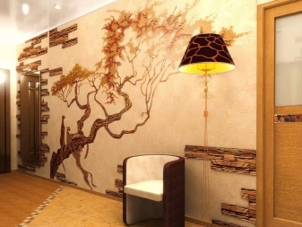 Damit ein solches Finish lange hält, müssen hochwertige Tapeten ausgewählt werden. Für die Gestaltung des Flurs ist perfekter dekorativer Stein in Kombination mit flüssigen Malereien. Eine gute Option dafür ist auch die Dekoration der Wände mit Tapeten Wandbild, Bambus oder Blätter zum Bemalen.