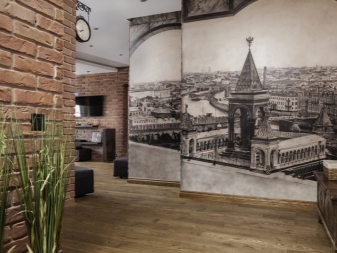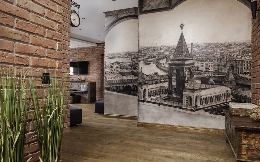 - harmonische Mischung mit anderen Arten von Oberflächen. Der Stein kann nicht nur mit Tapeten, sondern auch mit Fliesen, Holz oder Gips ergänzt werden.