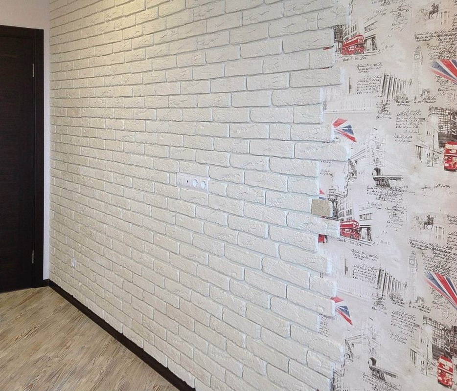 Es ist möglich, Tapeten mit Natur- und Kunststein zu kombinieren.