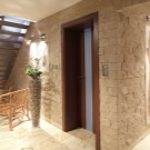 Die Eingangshalle mit grauem Dekorstein wirkt unglaublich stilvoll und einzigartig.