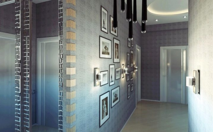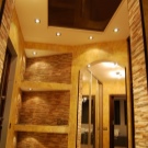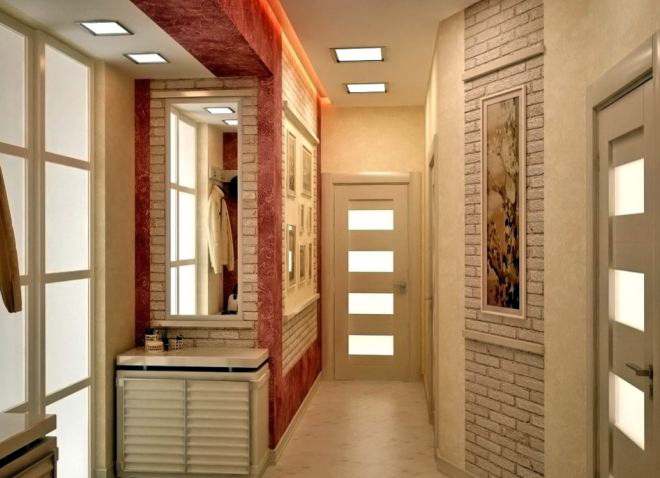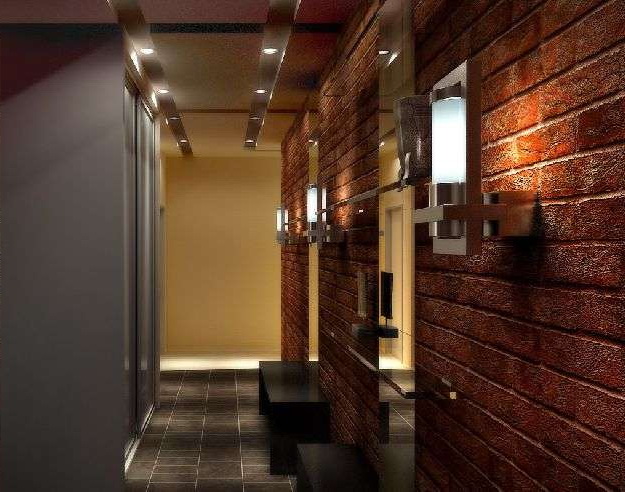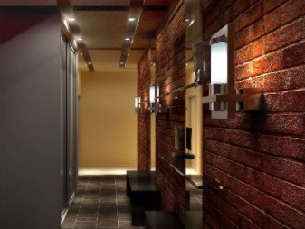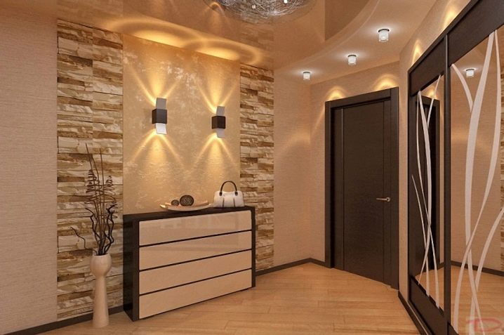 Wenn Sie die Wände des Flurs mit einem dekorativen Stein schmücken, sollten Sie das Beleuchtungssystem überprüfen. Designer empfehlen, die zentrale Deckenbeleuchtung aufzugeben und gleichmäßig verteilte Lampen an Decke und Wänden zu kombinieren. Als zusätzliche Beleuchtung können Sie Wandlampen oder LED-Streifen verwenden. So wird es sich herausstellen, das Relief und die natürliche Schönheit des Steins zu betonen.