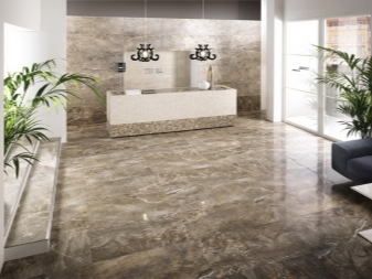Mit Hilfe von dekorativen Fliesen, die Naturstein imitieren, können Sie nicht nur die Wände, sondern auch den Boden dekorieren.Eine solche schöne Beschichtung verursacht keine großen Probleme bei der Reinigung und Pflege.