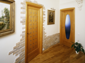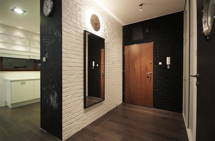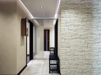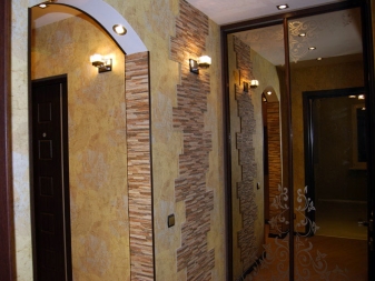 Wenn Sie einen kleinen Flur machen, ist es wichtig, das Maß zu kennen und es nicht mit Fertigmaterialien zu übertreiben. Bei der Dekoration mit Stein ist es besser, auf die Kombination verschiedener Materialien zu verzichten und sich für eine Option zu entscheiden.Andernfalls riskieren Sie, dass die Dekoration zu bunt wird und den Raum überlastet. Für einen Flur wird eine Kombination von zwei Arten von dekorativen Fragmenten als optimal angesehen. Gleichzeitig können Materialien eine Farbe haben, sich aber in der Textur unterscheiden.