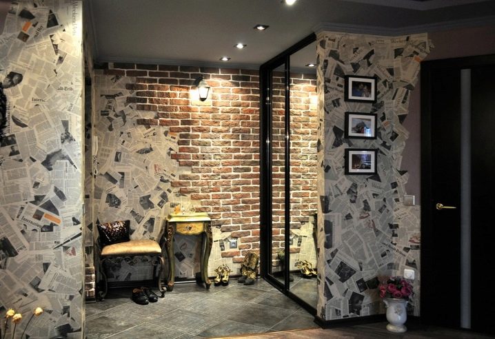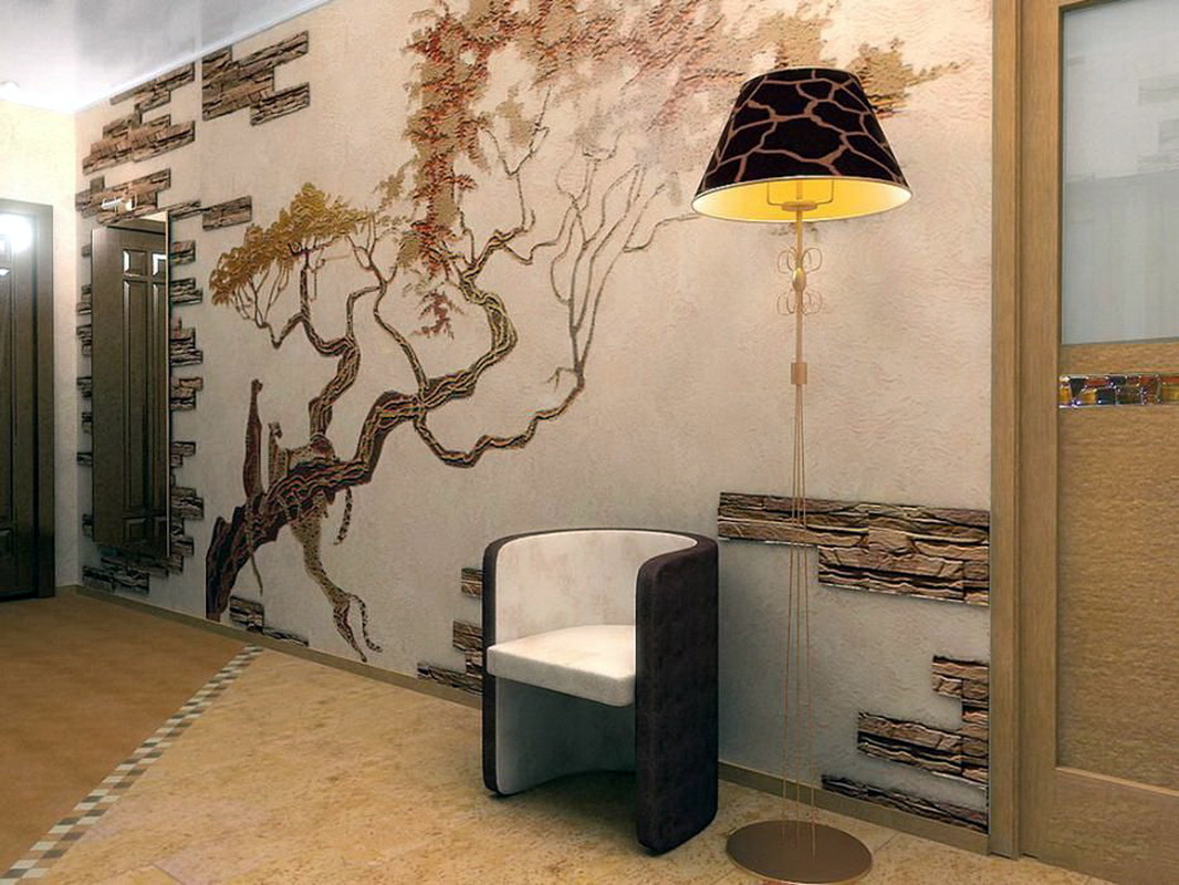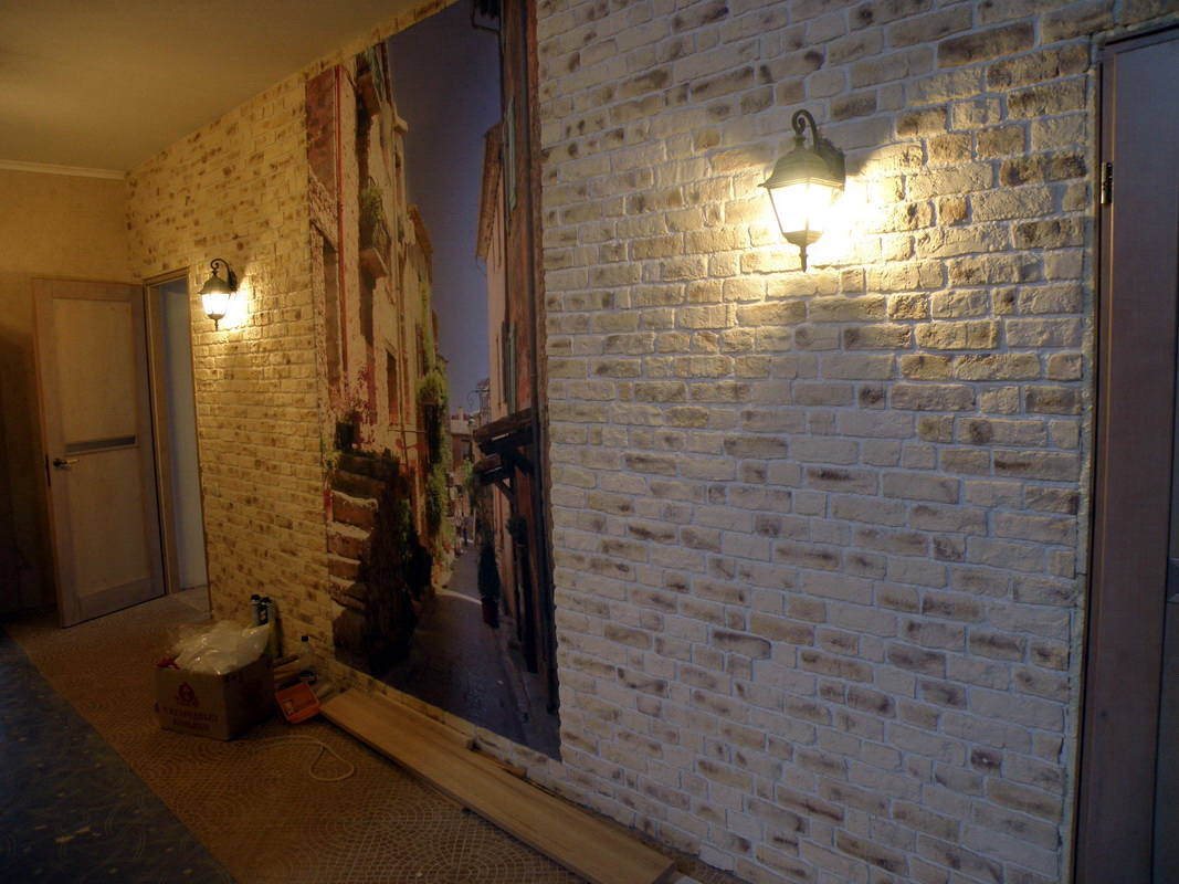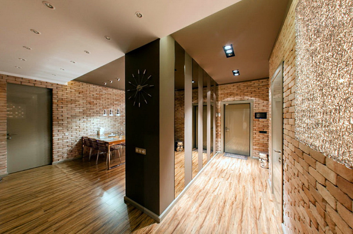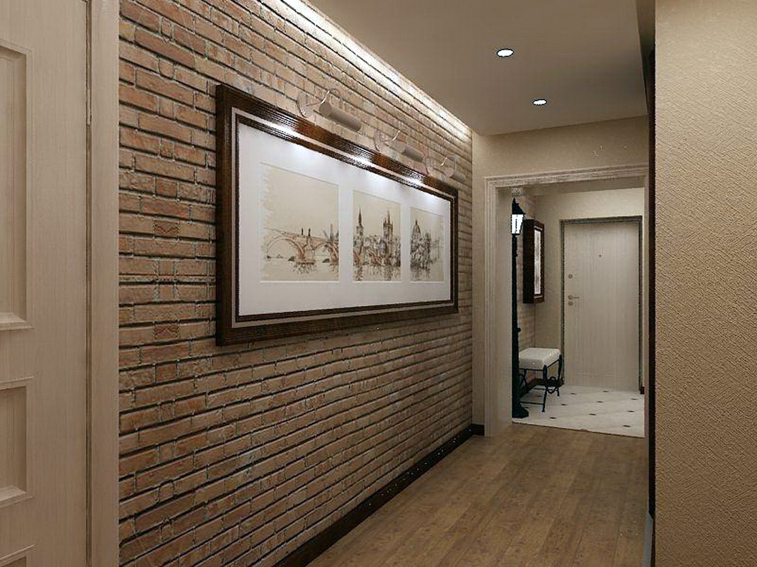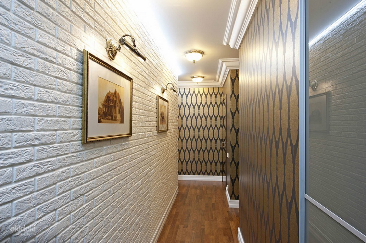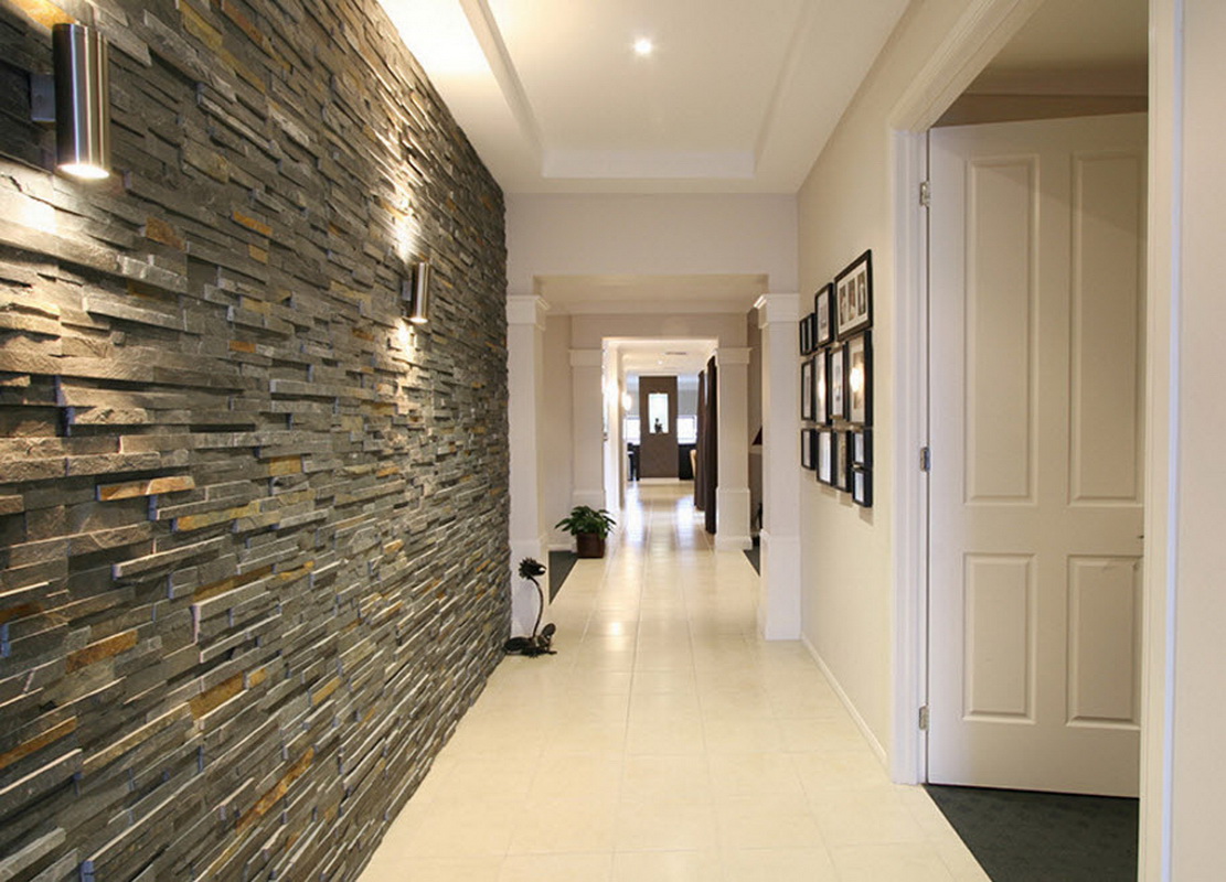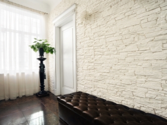 Bei der Auswahl der Fliesen für die Inneneinrichtung muss man von der Textur, Farbe, Größe und Form ausgehen. Um einen kleinen Korridor zu reparieren, ist es besser, einen Kunststein mit einer Mindestdicke zu wählen. Auf diese Weise können Sie die Fliese in einer dünnen Schicht verlegen, und Sie müssen keine zusätzlichen Arbeiten ausführen, um die Wand zu verstärken. Sie können auch geprägte Wandpaneele mit Natursteinmuster als Dekor verwenden. Ein solches Veredelungsmaterial wird viel schneller montiert und erfordert keine glatt ausgerichtete Wand.