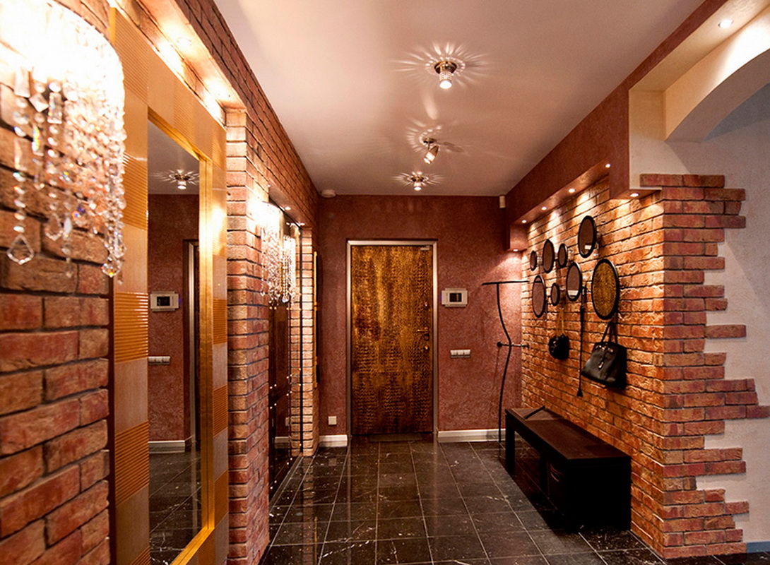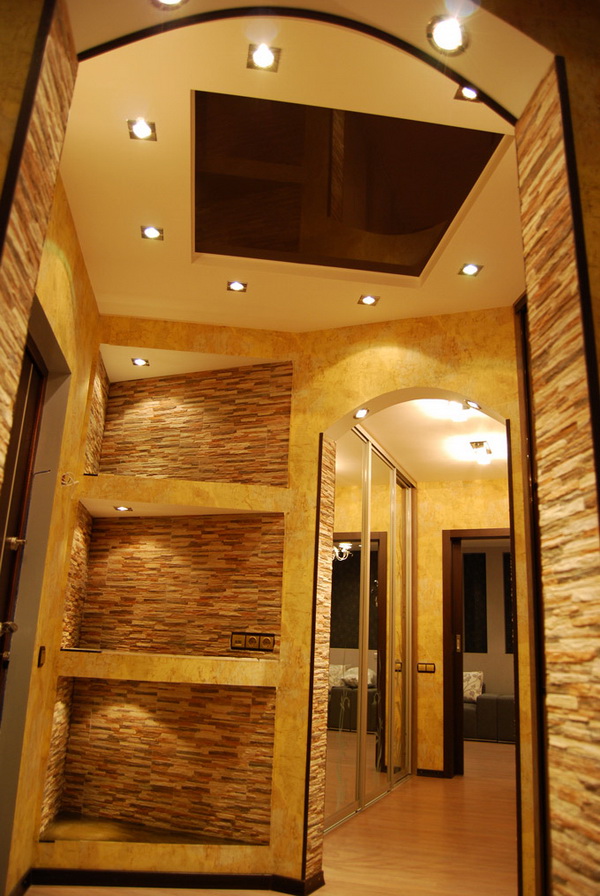 Um den Flur zu dekorieren, ist es nicht notwendig, alle Wände mit Stein zu verkleiden. Ein solches Finish kann eine Geldverschwendung sein.Eine rationellere Lösung wäre die Schaffung und Platzierung von Akzenten in bestimmten Abschnitten des Korridors. Sehr schön sieht fragmentarisches Design der Wand in der Nähe der Tür, Spiegel oder Möbel. Partial Futter hat eine stilvolle Optik, kann es verwendet werden, um die folgenden Innenelemente zu dekorieren: