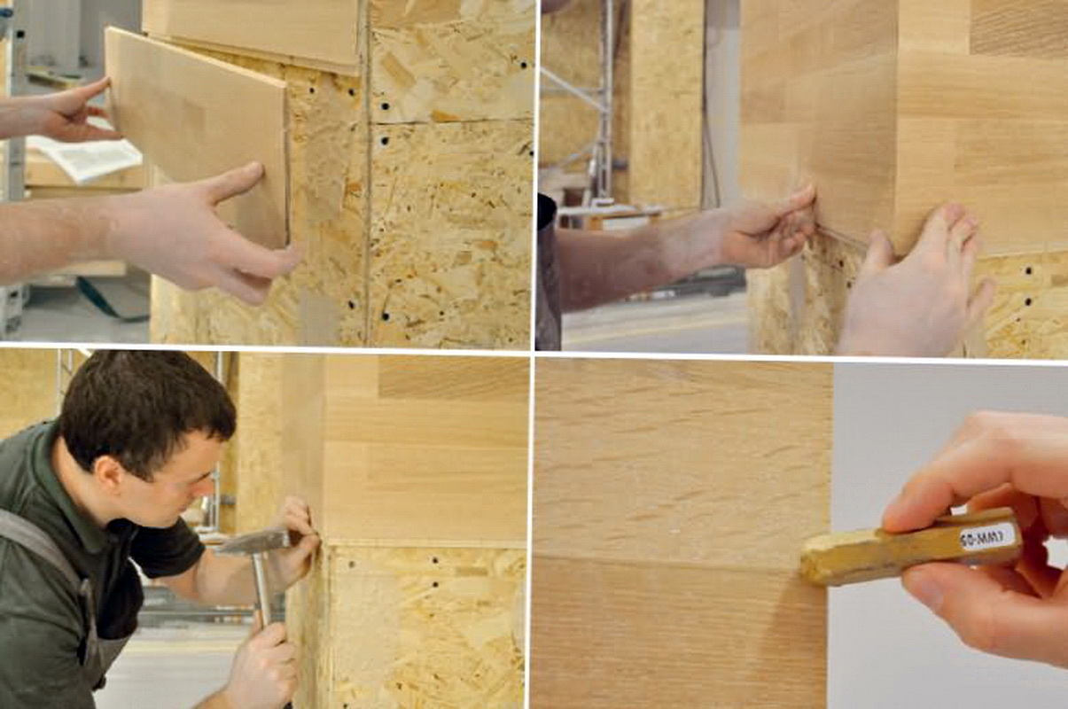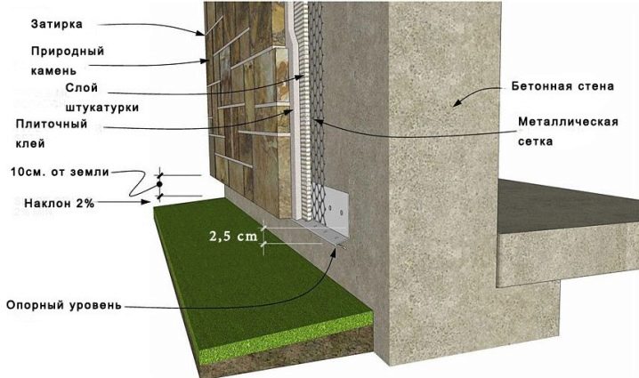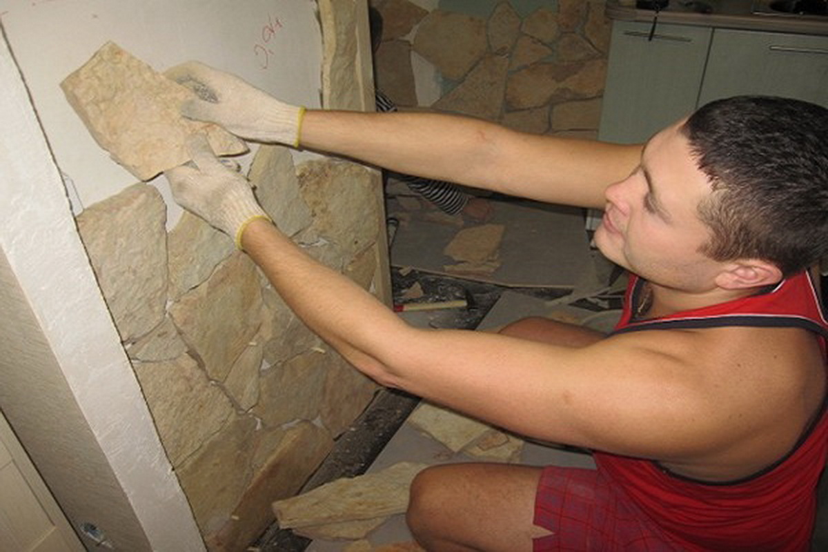 Der Stein sollte streng waagerecht montiert werden, also den Markup mit einem Bleistift auf die Wand setzen und eine Stufe benutzen. Arbeit ist bequemer, um von der Unterseite der Ecke anzufangen. Bei einer partiellen Dekoration der Wand wird die Rückseite des dekorativen Elements mit einer Bürste von Staub und Schmutz gereinigt, dann mit Wasser angefeuchtet, eine gleichmäßige Schicht aus Spezialkleber wird mit einem Spachtel aufgetragen. Die Fliese wird mit der obligatorischen Kontrolle über die Ebene dicht an die Wand gepresst. Für besseren Halt können Sie mit einem Gummihammer auf die Steinoberfläche klopfen.