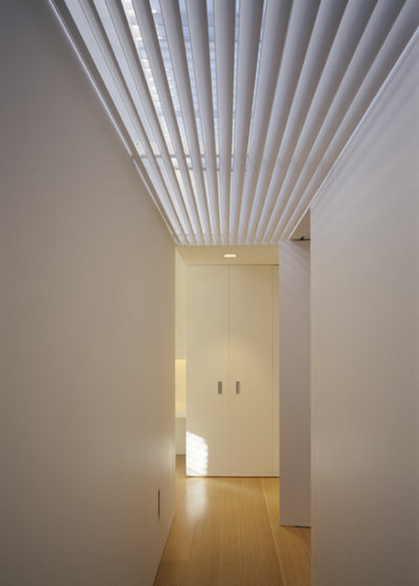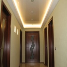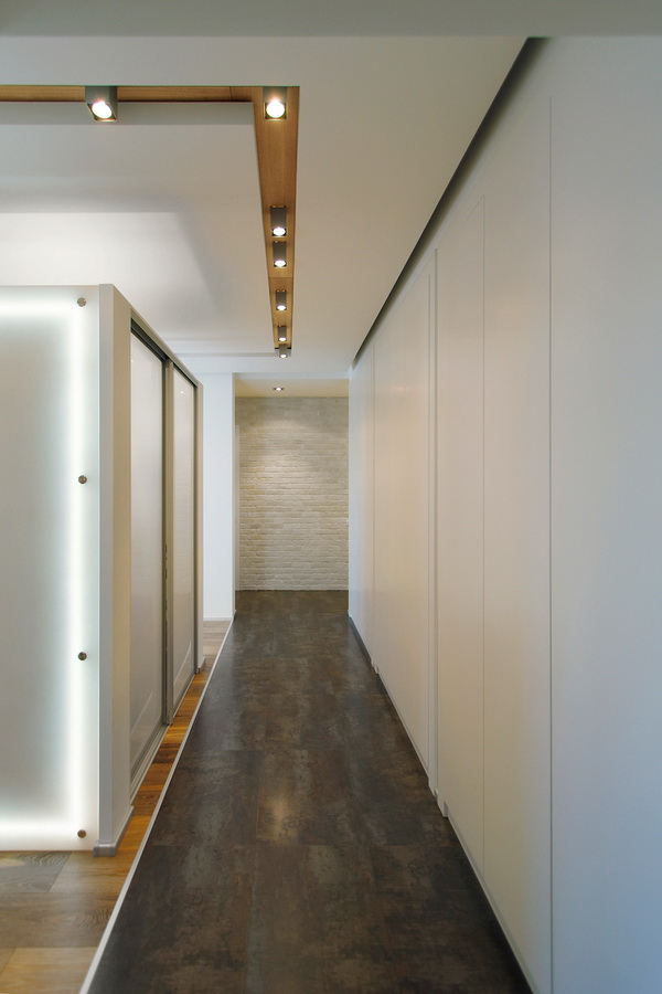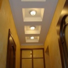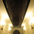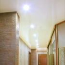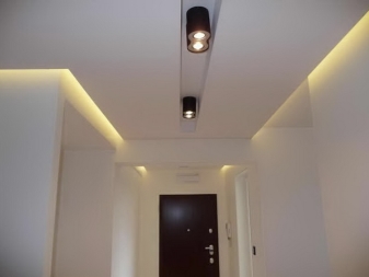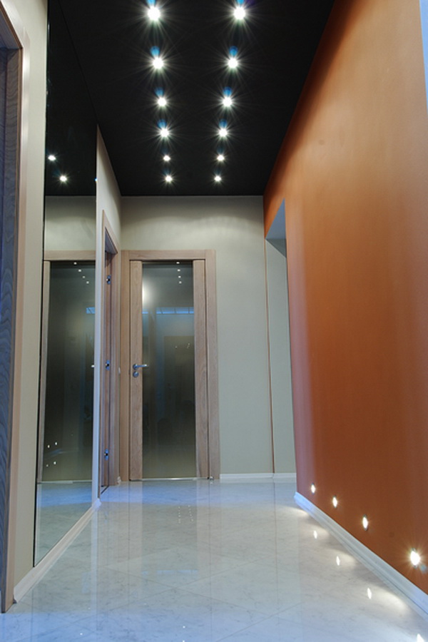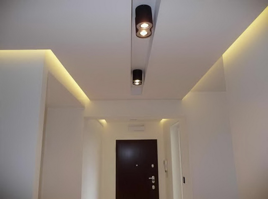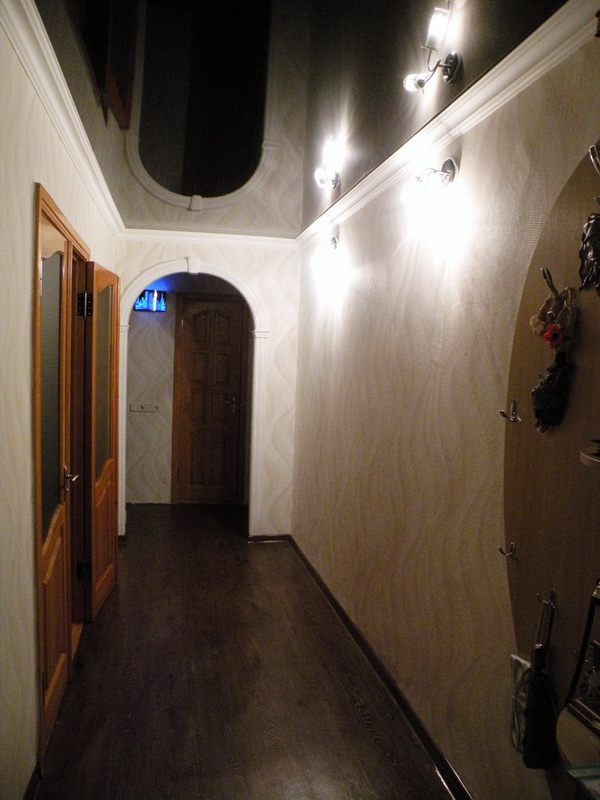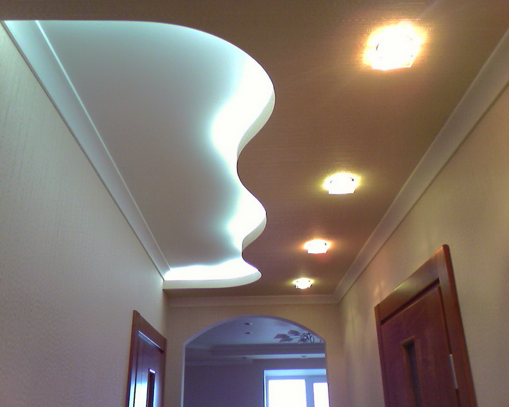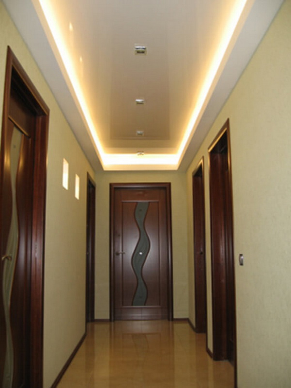 Für einen langen Korridor. Diese Anordnung des Flurs findet man am häufigsten in unseren Wohnungen. Die Deckengestaltung sollte folgende Aufgaben lösen: den Raum optisch erweitern und den Raum verkürzen. Es ist besser, die Optionen zu wählen, bei denen die Farbe der Decke heller erscheint als der Schatten der Wände. Die beste weiße Oberfläche wird berücksichtigt. Das Volumen wird glänzend glänzende Materialien erzeugen und die Querlinien werden den Korridor erweitern. Komplizierte mehrschichtige Gipskartonstrukturen an der Decke und LED-Beleuchtung helfen, die Situation zu glätten.