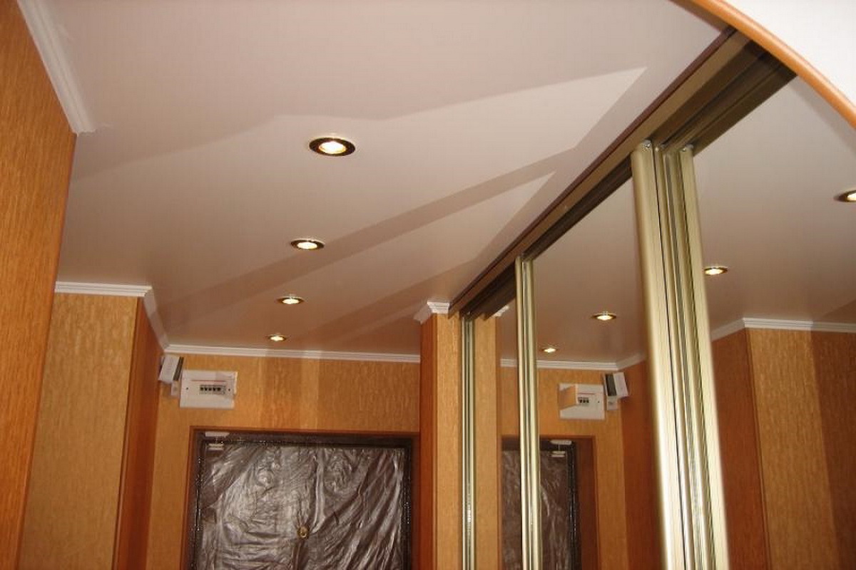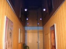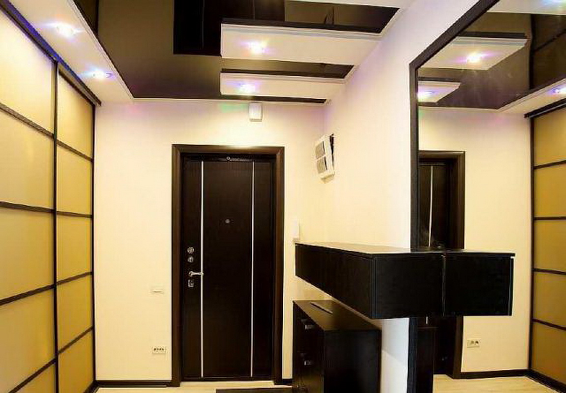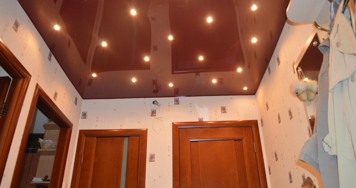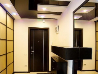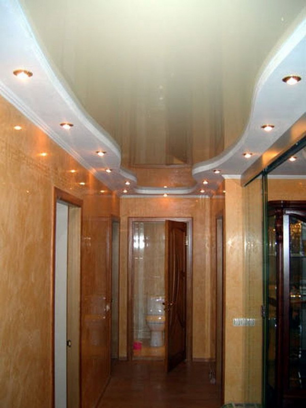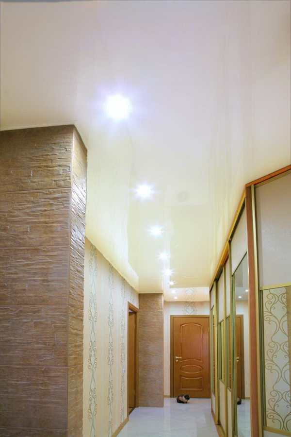 Für "Chruschtschow". Hallen im "Chruschtschow" haben ihre eigenen Besonderheiten. Vor allem haben sie eine sehr niedrige Decke, die kaum 2,5 Meter erreicht. Und das Gebiet selbst ist bescheiden in der Größe.Add Leichtigkeit und Raum kann die Decke aus glänzendem PVC-Folie von einer hellen Farbe strecken. Eine große Anzahl von Einbauleuchten füllt den Flur mit Licht und hebt die Decke optisch an.