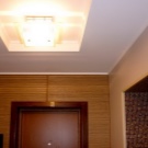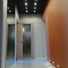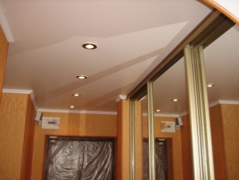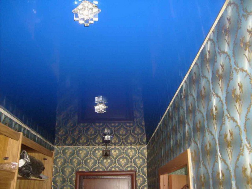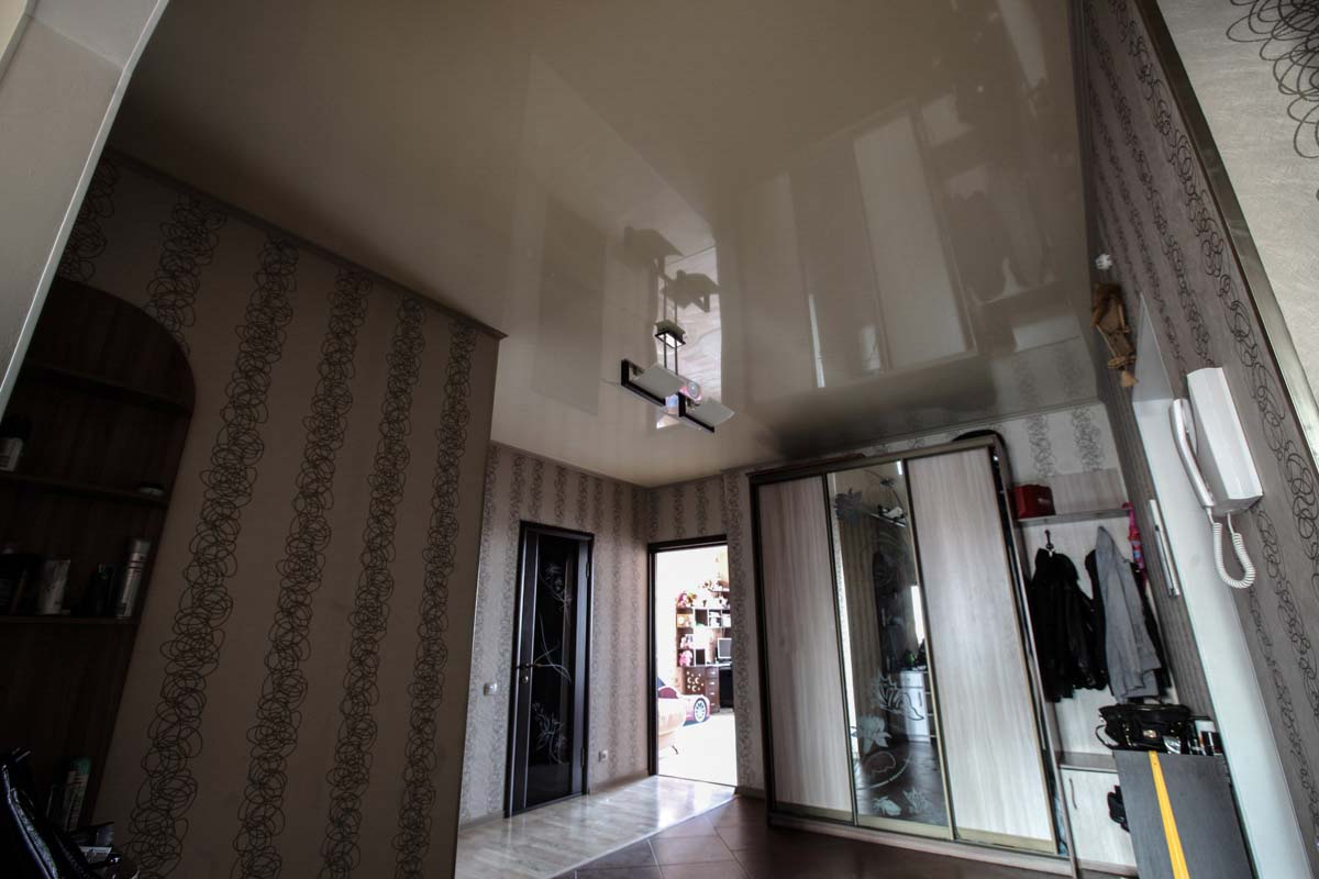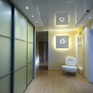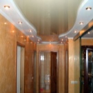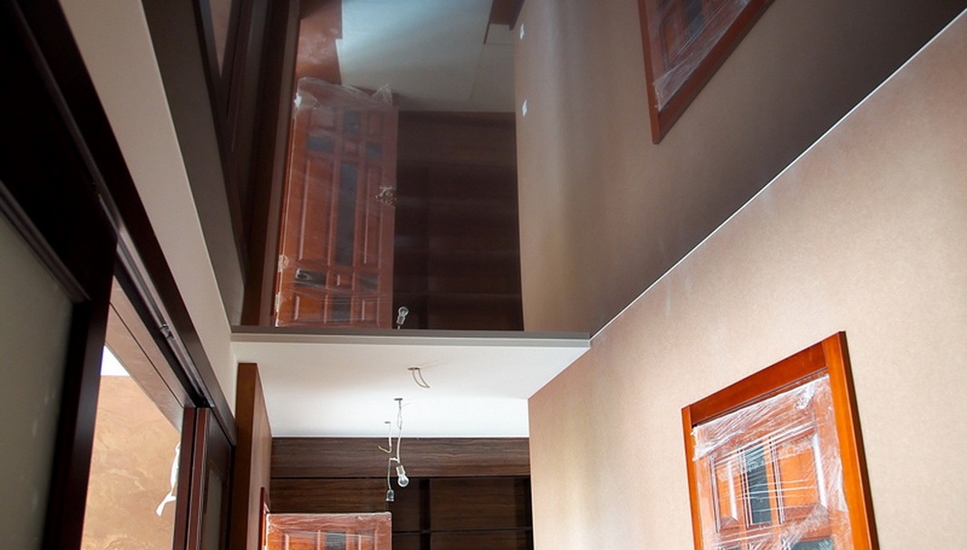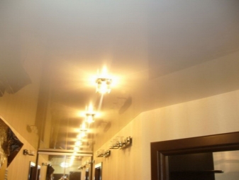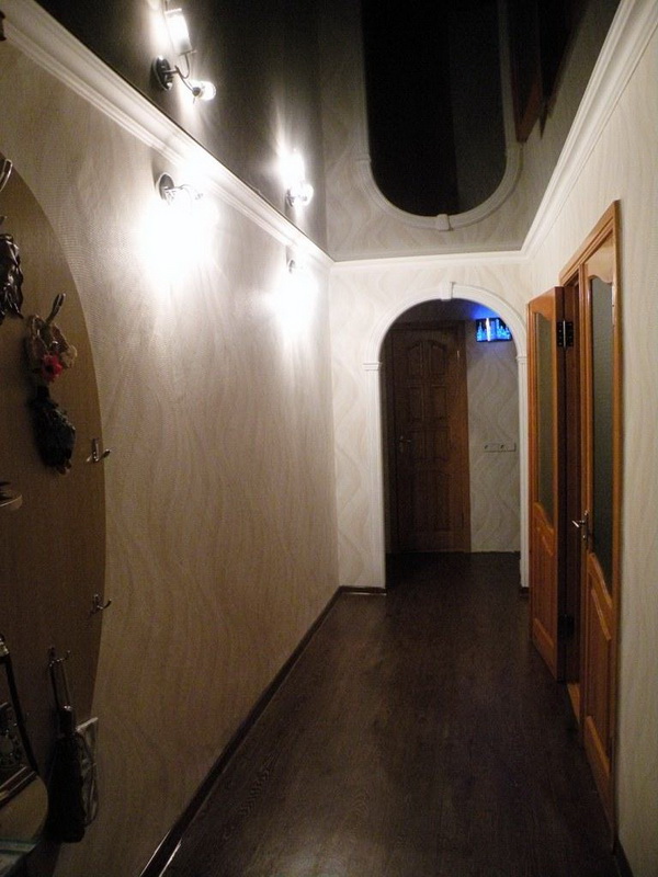Für "Chruschtschow". Hallen im "Chruschtschow" haben ihre eigenen Besonderheiten. Vor allem haben sie eine sehr niedrige Decke, die kaum 2,5 Meter erreicht. Und das Gebiet selbst ist bescheiden in der Größe.Add Leichtigkeit und Raum kann die Decke aus glänzendem PVC-Folie von einer hellen Farbe strecken. Eine große Anzahl von Einbauleuchten füllt den Flur mit Licht und hebt die Decke optisch an.