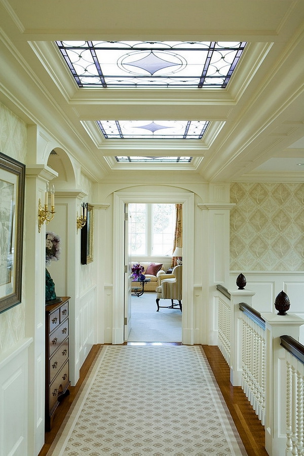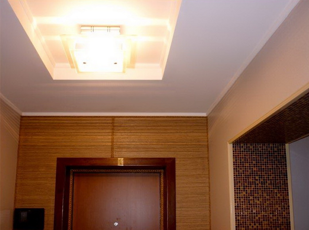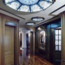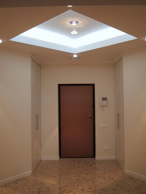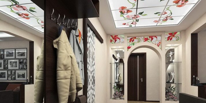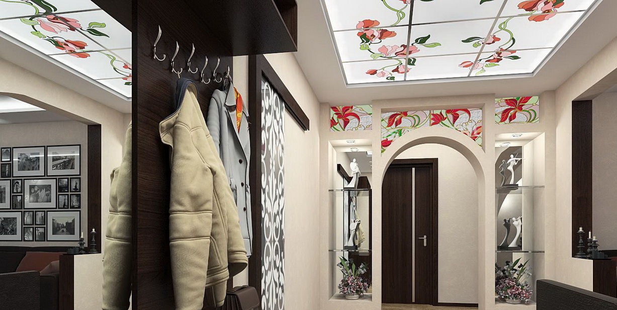 In einer modernen Wohnung. Heutzutage zeichnen sich Wohnungen durch eine gelungene Anlage und breite, vollwertige Flure aus. In solchen Korridoren sind verschiedene Konstruktionstechniken und -methoden zulässig. Wenn Fantasie und materielle Mittel es erlauben, können Sie eine Kombination von verschiedenen Arten von Materialien, mehrstufigen Strukturen verwenden. Zum Beispiel eine Mischung aus Trockenbau und Buntglasdecke.