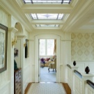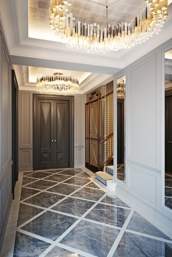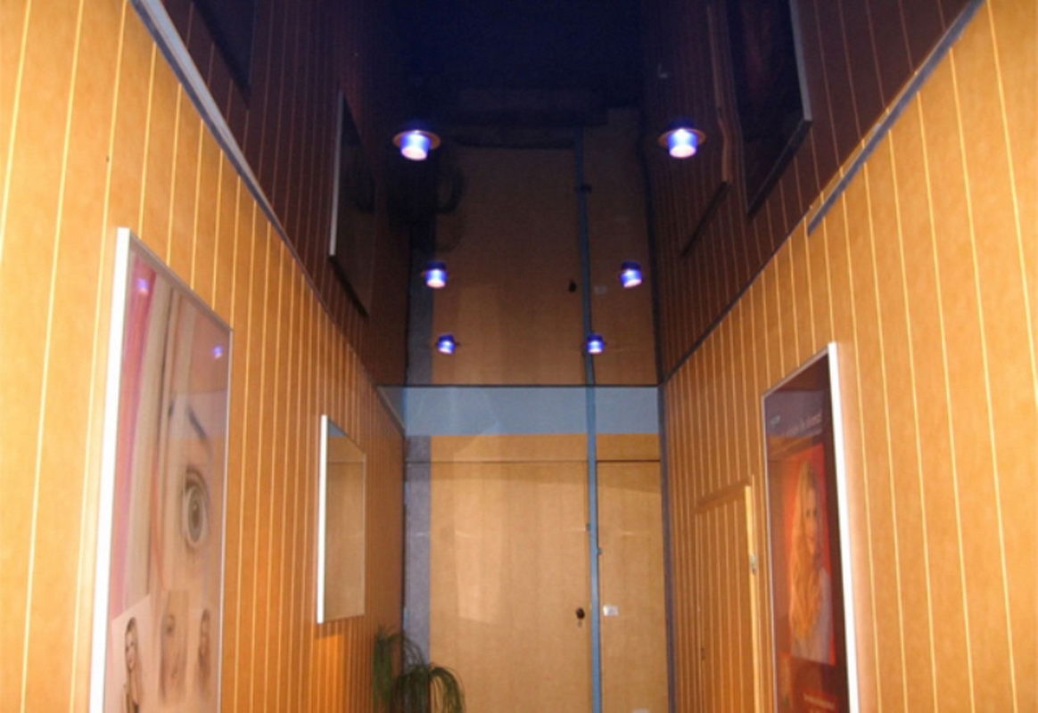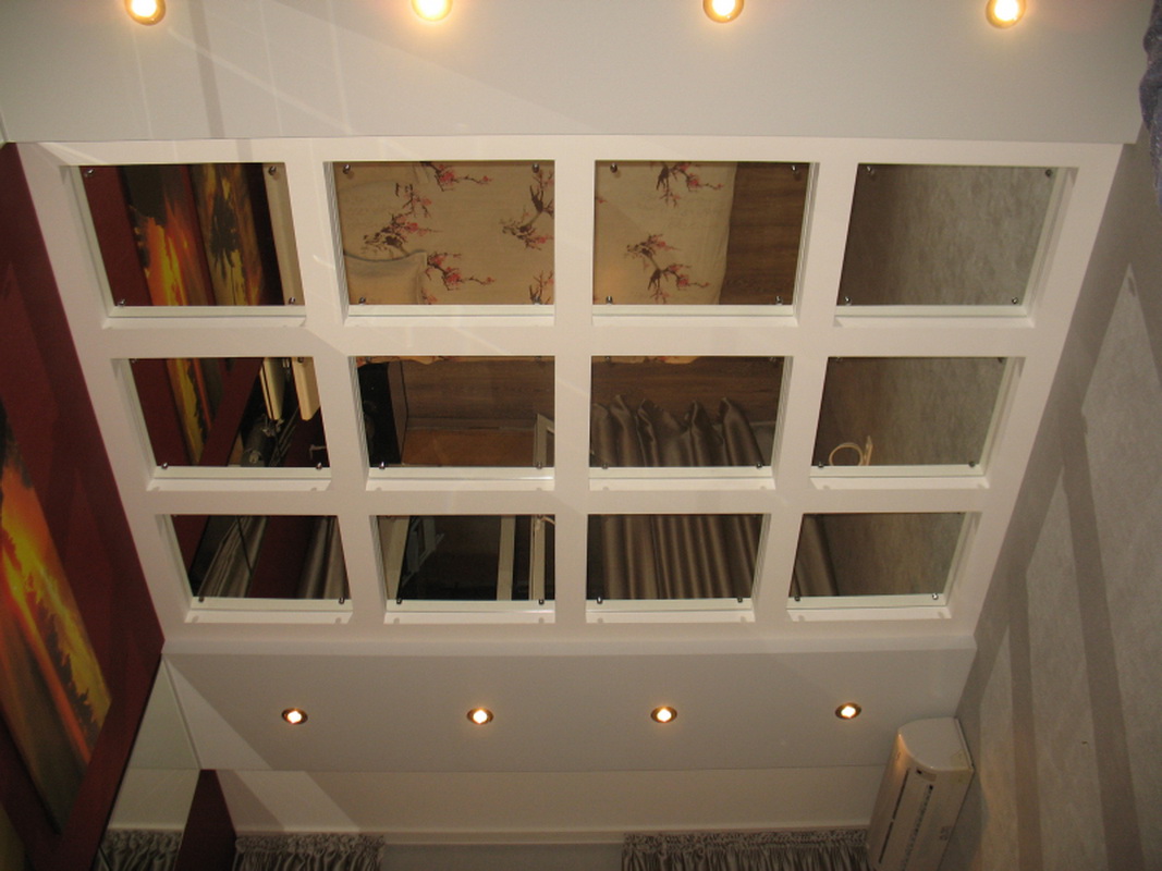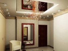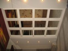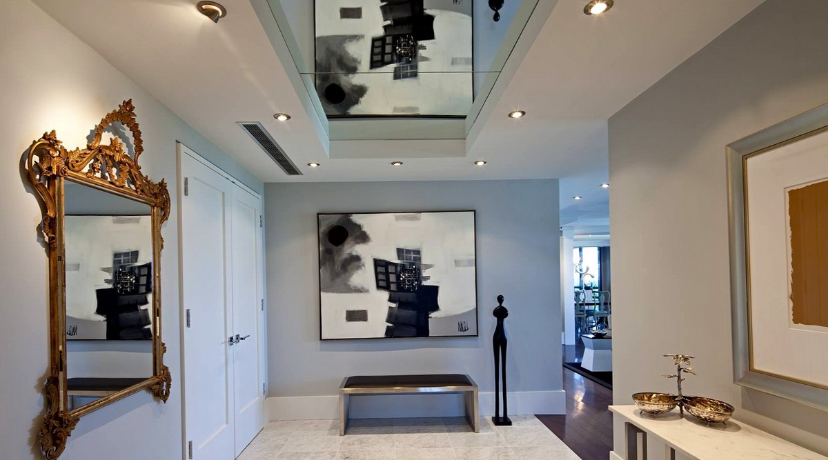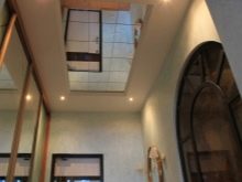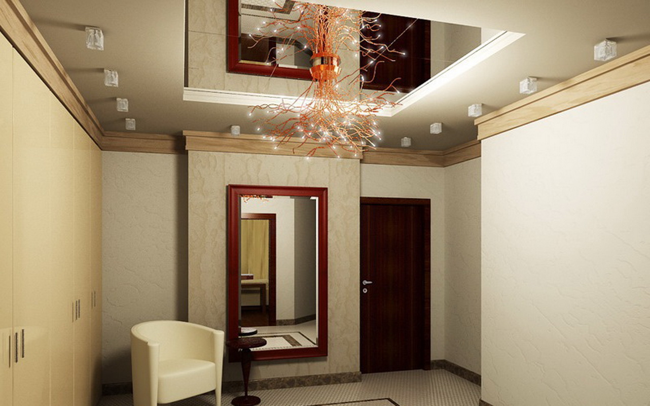 Gespiegelte Decken. Eine mutige und unkonventionelle Lösung für die Gestaltung von Flur und Flur. Zur Montage wird eine Rahmenkonstruktion verwendet, auf der Spiegelplatten montiert sind. Dieses Finish ermöglicht es Ihnen, die Höhe, die Fläche des Raumes visuell zu erhöhen, ihm Luftigkeit hinzuzufügen.Lichtquellen, die in den Spiegeln reflektiert werden, schaffen eine einzigartige und unnachahmliche Beleuchtung.