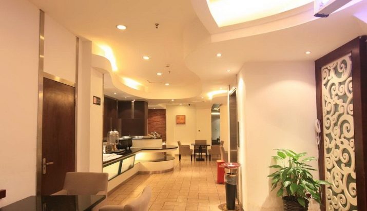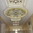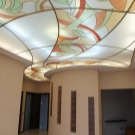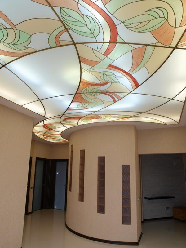 Zu den elitären und teuersten Optionen gehören Buntglasdecken mit integrierter Beleuchtung, mehrstufige Designs in Kombination verschiedener Materialien. Sie betonen die Individualität und den Status des Eigentümers der Wohnung.