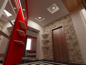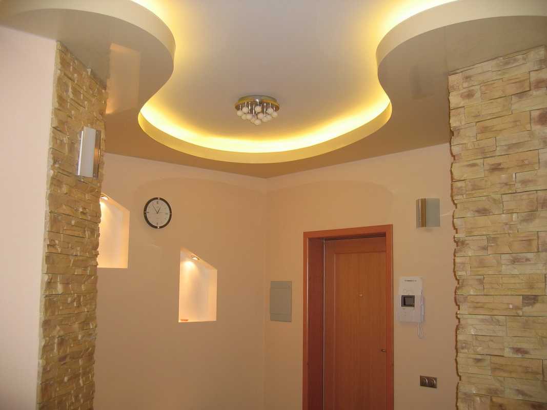 - Trockenbau Konstruktionen dieses Materials sind am relevantesten für die Fertigstellung von Flur und Flur. Drywall ermöglicht es Ihnen, mehrstufige Decken jeder Komplexität mit verschiedenen Arten von Beleuchtung zu schaffen, die gekonnt im Raum spielen.Verschiedene Bögen, Pilaster und dekorative Säulen geben eine stilistische Orientierung und eignen sich für die Raumeinteilung. Das Material erfordert keine gründliche Oberflächenvorbereitung oder Nivellierung, und Sie können Kabel, Lüftungssysteme oder andere Kommunikationsobjekte hinter Gipsplatten verbergen.