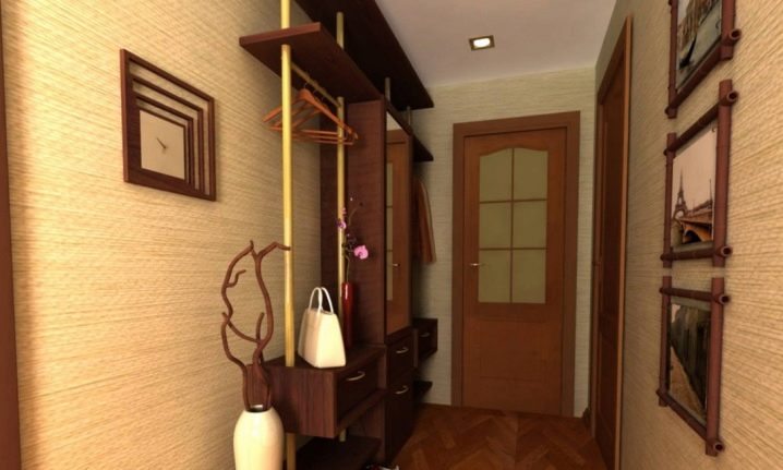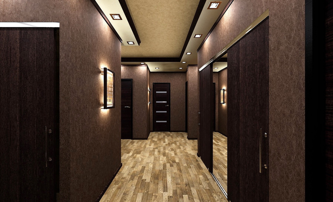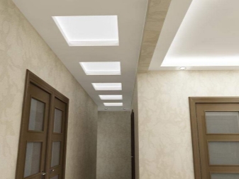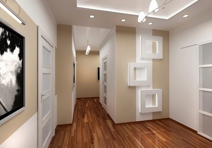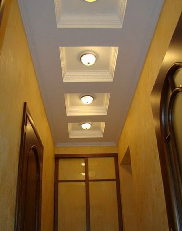 Für "Breschnewki." Eigenschaft der Wohnung - ein langer und schmaler Korridor. Eine interessante Lösung für die Decke kann als Holz- oder Spiegelstreifen dienen, Querstreifen geben den Eindruck eines breiten und kurzen Raumes. Nicht weniger erfolgreich ist eine Kassettendecke mit oder ohne Spiegel. Ein langer Flur mit Gipskartonbalken an der Decke wird originell aussehen. Diese Technik teilt den Raum in Stücke und gleicht das Ungleichgewicht aus.
