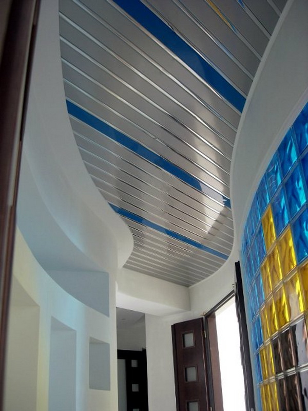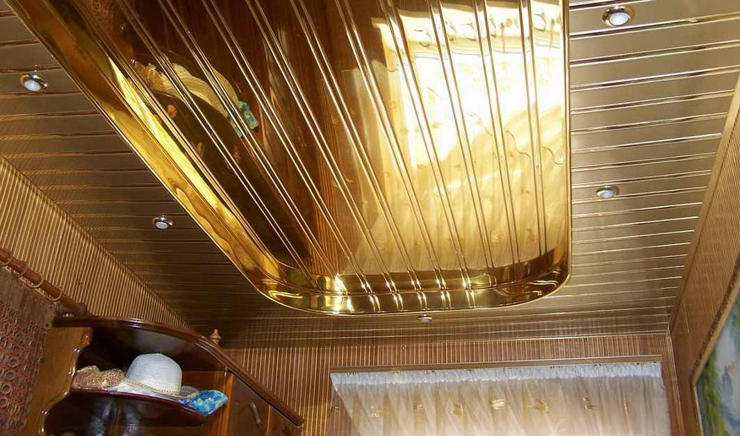 Rack (eine Art von suspendiert). Ideal für Nichtwohnräume, Räume mit hoher Luftfeuchtigkeit oder Heizungsmangel. Solche Decken sind feuchtigkeitsbeständig, sie haben keine Angst vor Temperaturänderungen und sind langlebig. Die Konstruktion des Regaltyps wird eher in Privathäusern als in Wohnungen verwendet. Das Material ist eine spezielle dünne Aluminiumlamellen, die eine Vielzahl von Farben haben können, glänzend oder matt. Vergoldete, Bronze- und Chromversionen sind besonders beliebt.