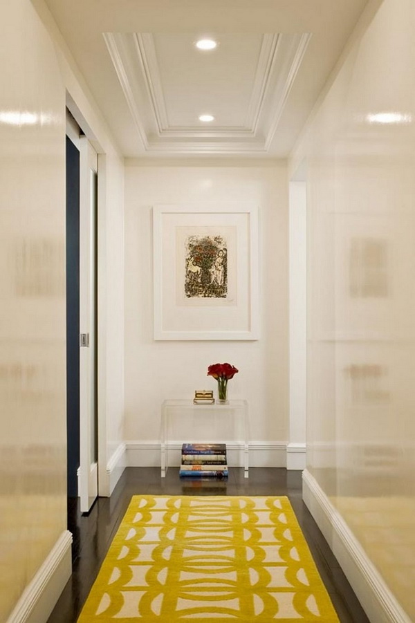 Vorteile von Weiß: Jede Inneneinrichtung und das Layout der Halle halten einer weißen Decke stand, an einer solchen Decke, die weniger sichtbaren Staub und andere Verunreinigungen abdeckt. Der Hauptvorteil der weißen Farbe ist ihre universelle Fähigkeit, mit irgendwelchen Farben in irgendwelchen Designs kombiniert zu werden, die es erlauben, sie in der gewählten Palette als eine Basis oder als eine zusätzliche Farbe zu nehmen. Das Eigentum von Weiß, um den Raum zu erweitern und zu vertiefen, wird eine Priorität sein, wenn Farben für die Decke in einem kleinen Flur gewählt werden.