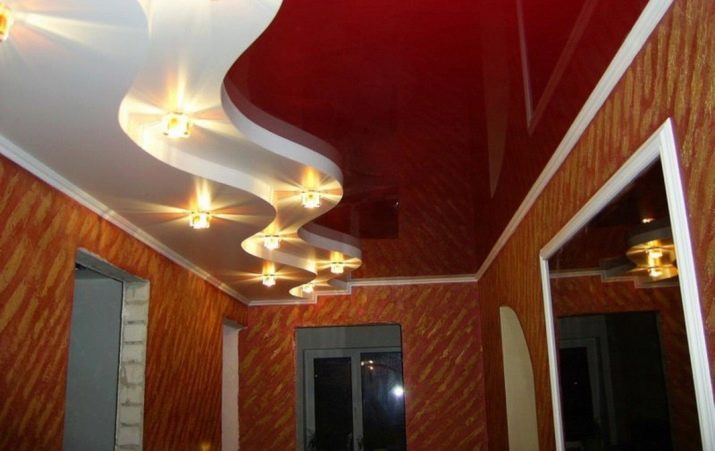 - Dargestellt Decken geben mehr Raum für Fantasie als flache Flächen und ermöglichen es, die Idee des Designers klar zu vermitteln. Als Materialien für die Dekoration wird häufig Schaum oder Trockenbau verwendet. Exklusiver sind lockige Spanndecken, die den Rahmen dehnen.