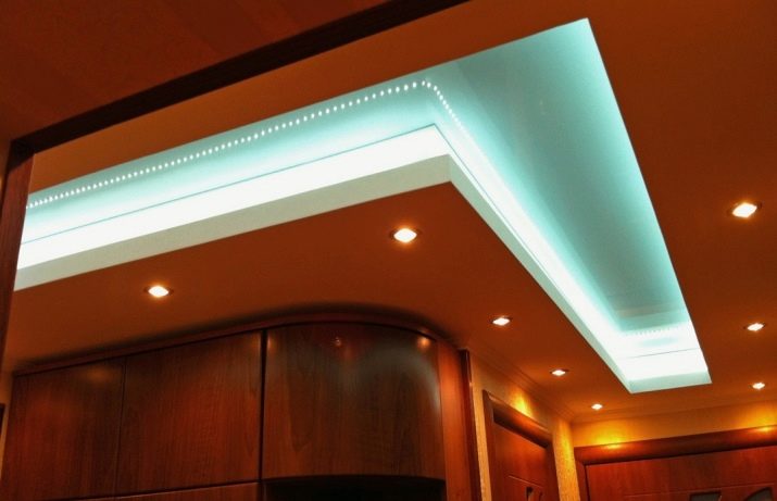 - LED Hintergrundbeleuchtung. LED-Streifen sind gut, weil sie sowohl an den Wänden als auch an der Decke montiert werden können. Verwendet mehr als zusätzliche Beleuchtung - für einen dekorativen Effekt. Wenn die Lichtquelle um den Umfang des Raumes angeordnet ist, verleiht sie der abgehängten Decke Leichtigkeit und den Effekt des Aufsteigens.