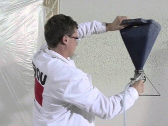 In Bezug auf Strukturputz ist zu beachten, dass der Eimer mit bestimmten Arten der Beschichtung zurechtkommt. Zum Beispiel trägt es zur Schaffung von Texturen "Borkenkäfer", "Pelzmantel", "Chagrin" und venezianischen Gips bei. Es kann verwendet werden, wenn mit Mehrfarben- und Mosaikfarben, Baumwollbeschichtungen, Mischungen mit Glas und Schaumchips gearbeitet wird. Es eignet sich auch zum Sprühen von Kork. Zur gleichen Zeit erlaubt die Vorrichtung zusätzlich zu Gips und Zementmischungen die Verwendung der folgenden Zusammensetzungen: