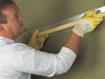 Nachdem der Putz auf die Wand aufgetragen wurde, wird er beschnitten. Führen Sie bei Bedarf ein strukturiertes Muster aus. Der Eimer wird sofort gereinigt.