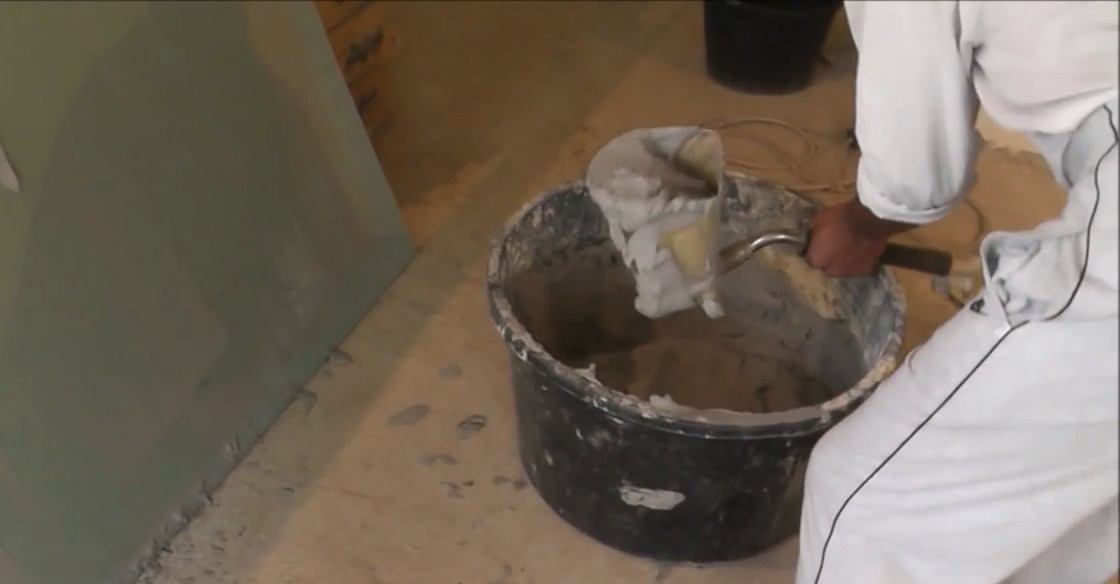 Das Prinzip der Arbeit mit einem Eimer ist einfach. Bringen Sie die gesamte Lösung auf einmal (es hat keine Zeit zum Trocknen). Nachdem sie den Eimer gefüllt und immer wieder geleert haben, bedecken sie die gesamte zu behandelnde Fläche mit Gips. Nach der Regel oder einem breiten Spatel und die Basis ebnen.