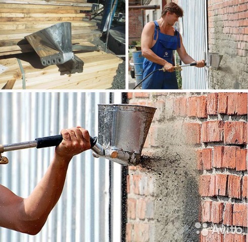 - Die Verwendung von Oberflächenmaterialien unterschiedlicher Zusammensetzung und Farbe. Zusätzlich zu der Tatsache, dass der "Trichter" nicht nur für Putz verwendet werden kann, ist er für Innen- und Fassadenarbeiten geeignet.