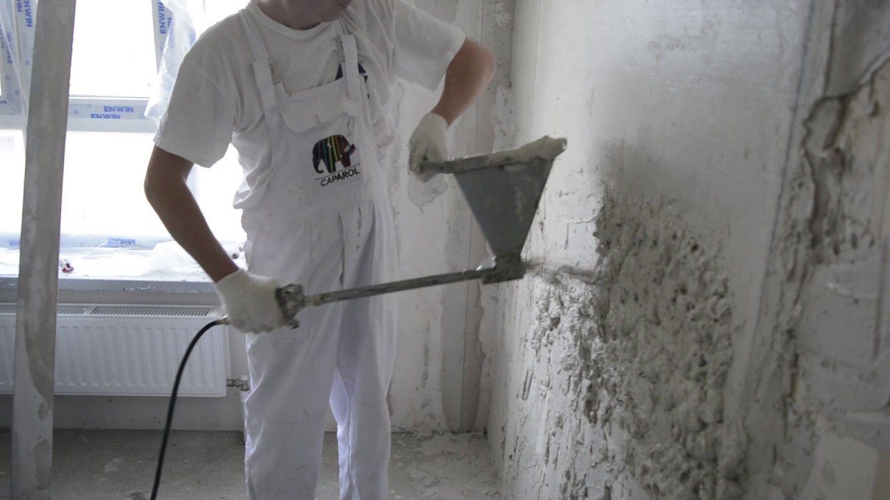 Vor der Benutzung des Zusatzgerätes wird die Oberfläche befeuchtet und Leuchttürme gesetzt. Verstärkungsgewebe kann benötigt werden. Der Trichter wird mit der Zusammensetzung gefüllt und auf den Boden gesprüht. Der Abstand von der Düse zur behandelten Oberfläche beträgt etwa 4 bis 5 cm.Während des Sprühens wird der Eimer allmählich bewegt, so dass die Schicht der aufgebrachtenMischung gleichmäßig ist.