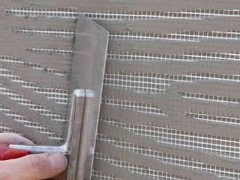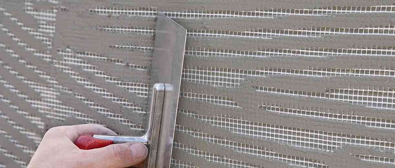 - Wenn die Isolierung an der gesamten Oberfläche der Fassade befestigt wird, sollte sie verstärkt werden. Das Verstärkungsgewebe wird in die Mineralwolle gepresst, die zuvor aufgetragene Klebstofflösung ist. Es ist vorzuziehen, ein Gitter mit kleinen Zellen zu verwenden, die gegen Feuchtigkeit und alkalische Formationen beständig sind.