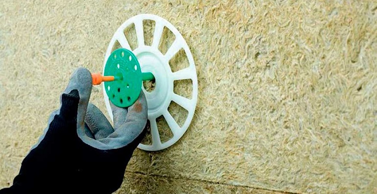 - Dann wird die gesamte Oberfläche der Mineralwolleplatte mit einem speziellen Klebstoff bedeckt und fest gegen die Wand gepresst. In den Ecken und in der Mitte der Platte werden Löcher gemacht, um Dübel mit breiten Kappen in sie einzuführen und sie zu verstopfen. Dies wird die Platte sicherer befestigen,und wird auch helfen, seine Verformung während des nachfolgenden Betriebs zu verringern.