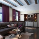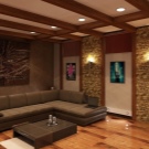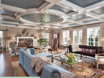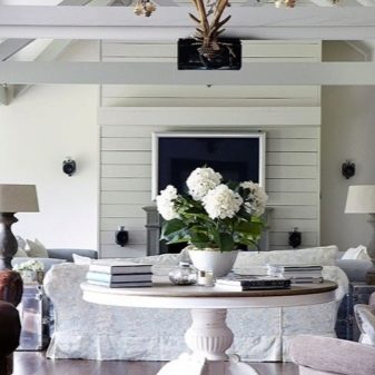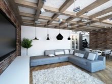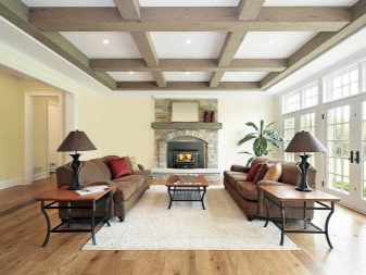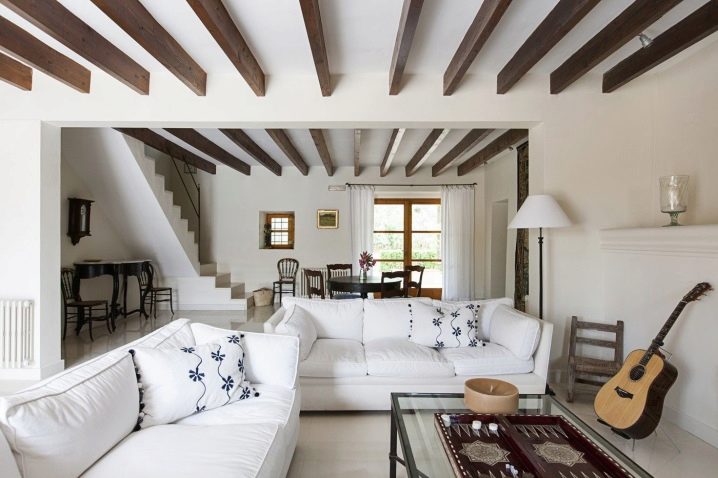 Meistens werden im Wohnzimmer Balken verwendet, um die Decke zu vervollständigen. Immerhin trifft sich hier die ganze Familie zum gemütlichen Beisammensein oder einfachen Teetrinken. Dieser Entwurf in den Häuschen oder in den Landhäusern überrascht niemanden. Aber um sie in Wohnungen zu benutzen, sind sie immer noch nicht sehr gut.