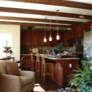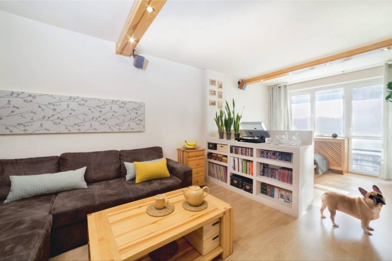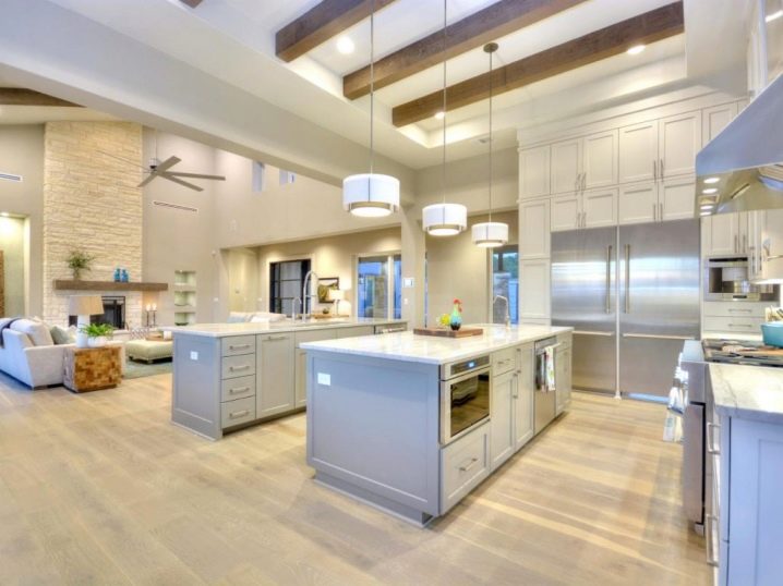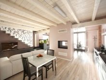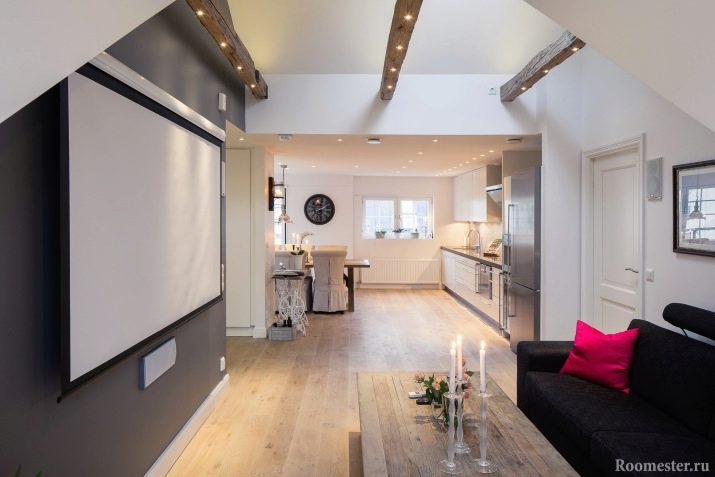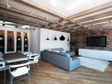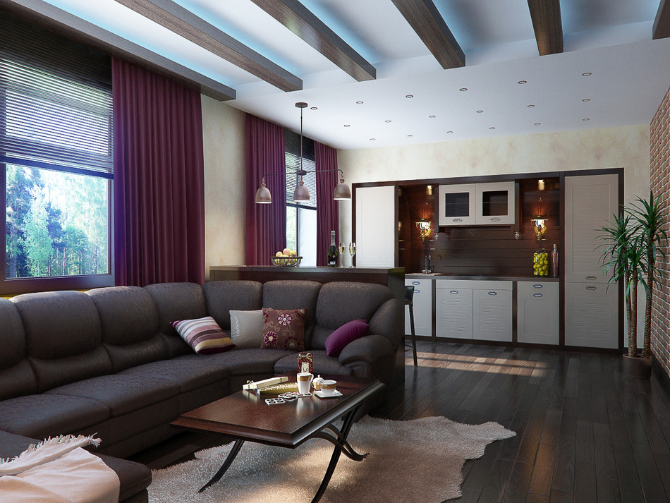 Mit Hilfe von Balken für die Decke können Sie den Raum in mehrere Zonen aufteilen. Wenn Sie die Küche und das Wohnzimmer nehmen, wird es nicht schwierig sein, mit einem Bartresen zu zonieren. Und die darüber liegenden Balken werden die Komposition perfekt ergänzen.