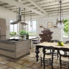 Rustikaler Stil wird von natürlichen Materialien dominiert. Dies beinhaltet Holz und Stein. Bei der Dekoration werden oft Balkenkonstruktionen aus Naturholz oder Holzimitat verwendet. Sehr oft werden sie künstlich gealtert.. Farben können hell und dunkel sein. All dies schafft eine gemütliche Atmosphäre.
