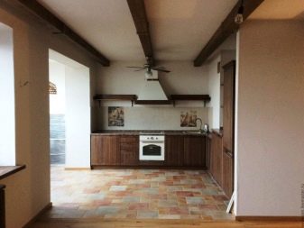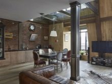 Viele kreative Besitzer entscheiden sich jedoch immer noch für einen solchen Schritt, indem sie sowohl natürliche Materialien als auch deren Nachahmung verwenden. Dies gibt der Wohnung die Wärme, die in einer lauten Stadt fehlt.