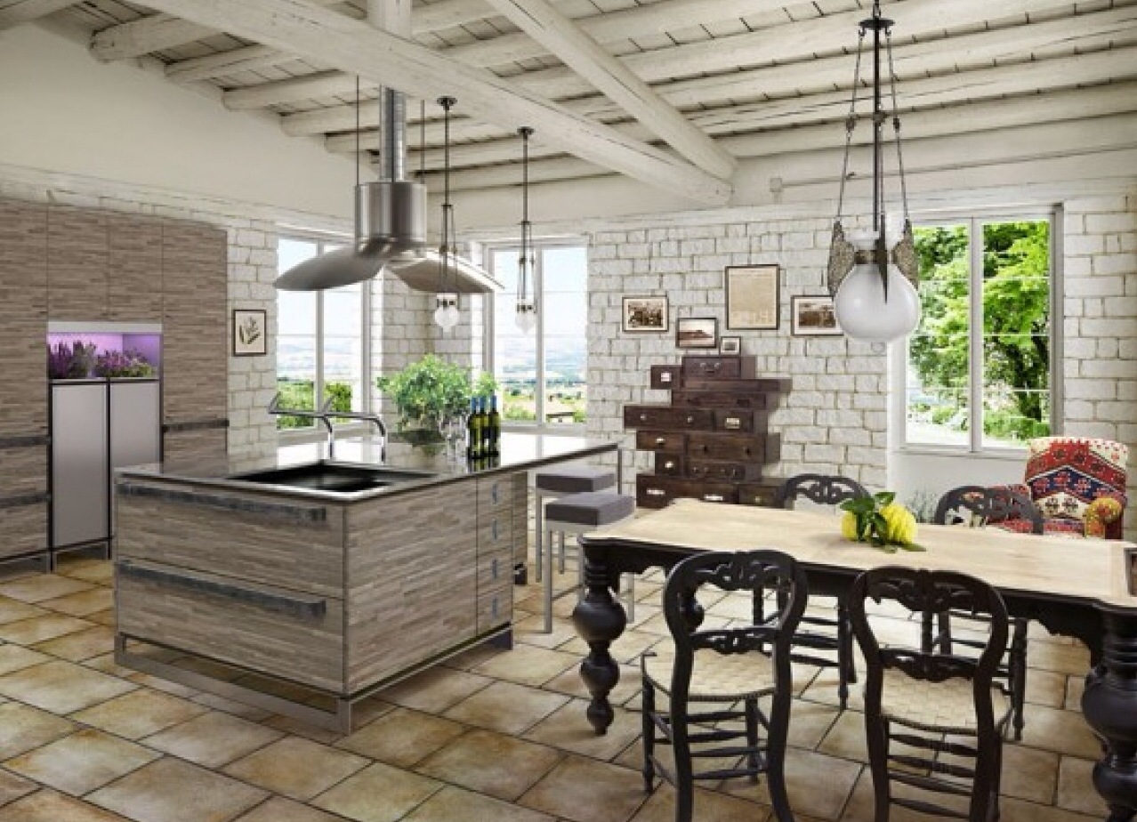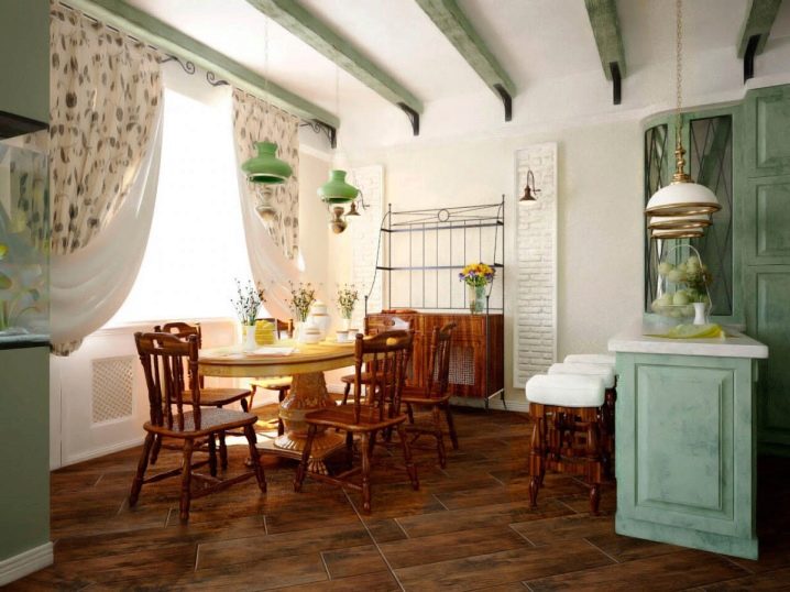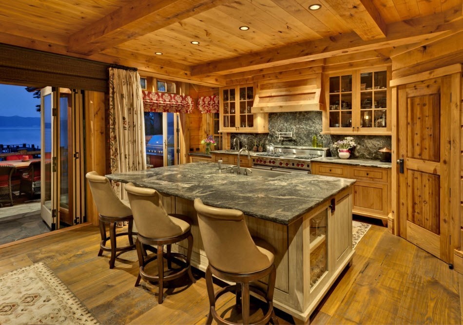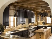 Bei der Herstellung einer Küche im rustikalen Stil wird oft Naturholz verwendet. Die Decke und die Balken, die darauf platziert sind, haben fast die gleiche Basis. Holzschränke sind auf dem Boden und gehen bis zur Decke selbst, die sehr schön aussieht.