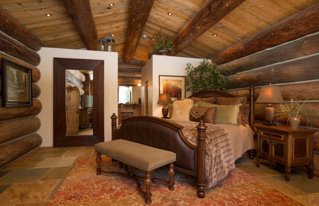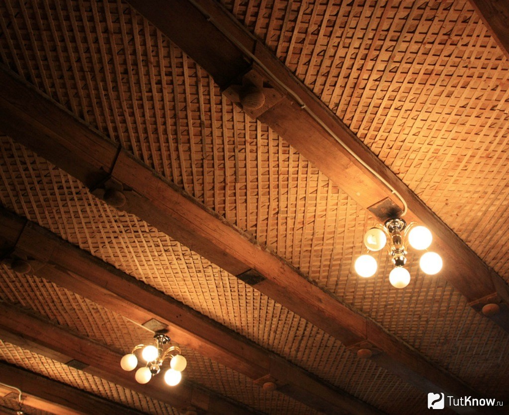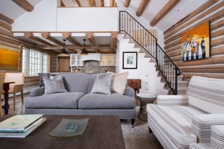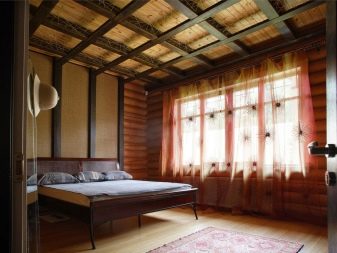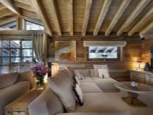 Der Innenraum enthält nur natürliche Materialien, die eine Person ein Gefühl der Sicherheit und Ruhe geben. Auf Decken aus Holzbalken sind aus Weichholz gefertigt. Oft sind Deckenbalken mit Konstruktionen von Stämmen oder Stäben an den Wänden verflochten. Im Laufe der Zeit verdunkeln sie ein wenig, weil der Baum Harz produziert.