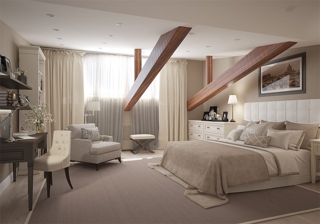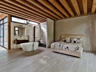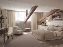 Wenn Sie ein Schlafzimmer auf dem Dachboden nehmen, ist die Decke mit Holzbalken für das Design in der besten Weise geeignet. Schließlich sind sie nicht so sehr die Elemente des Dekors als die tragenden Produkte, die den Rahmen des Gebäudes stützen.