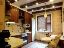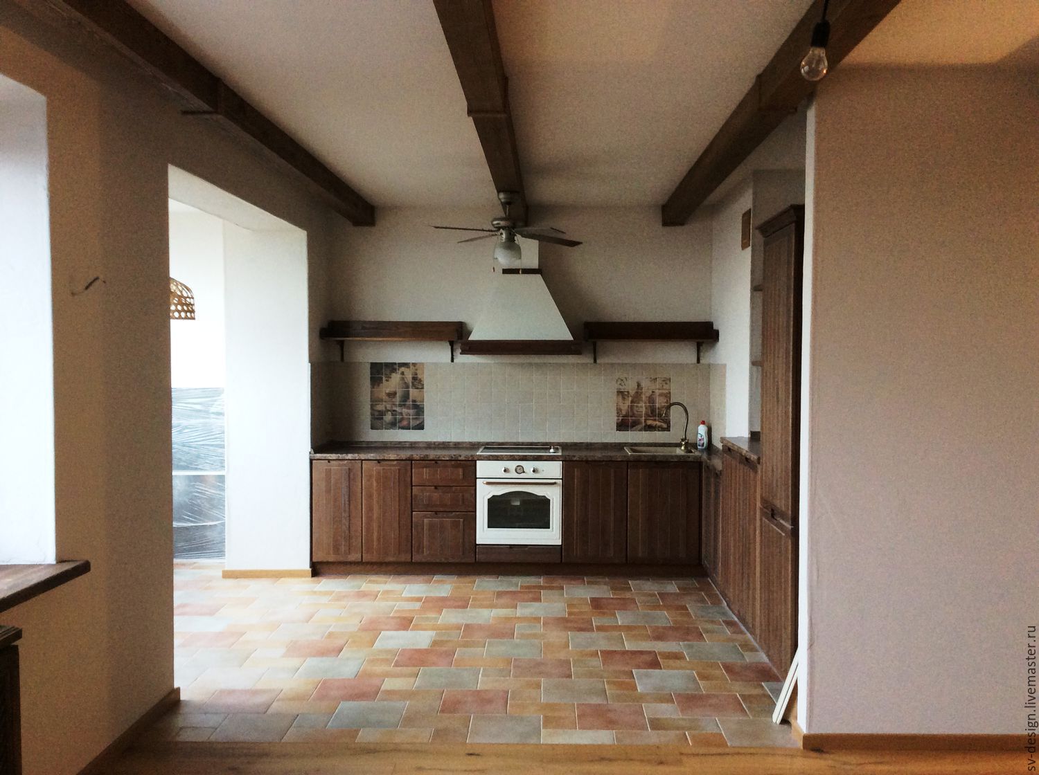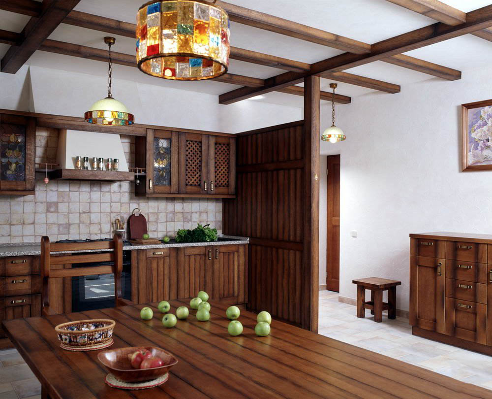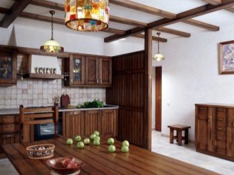 Für das Design der Küche in der russischen Tradition wird oft breite Balken für die Dekoration der Decke verwendet. Diese Option wird es Originalität geben. Oft für die Dekoration von Küchen wie Stein verwendet.Beide Öfen und Säulen können damit fertig gestellt werden. Es ist möglich, eine solche Technik mit Hilfe von Balken aus Holz zu schlagen.