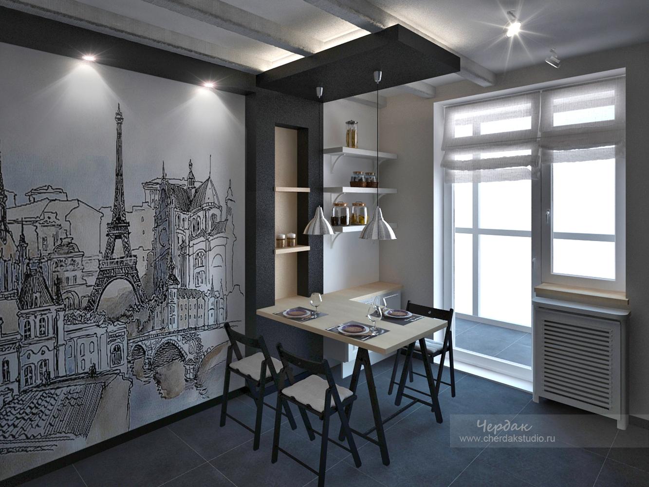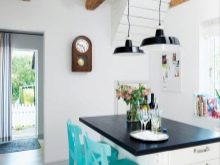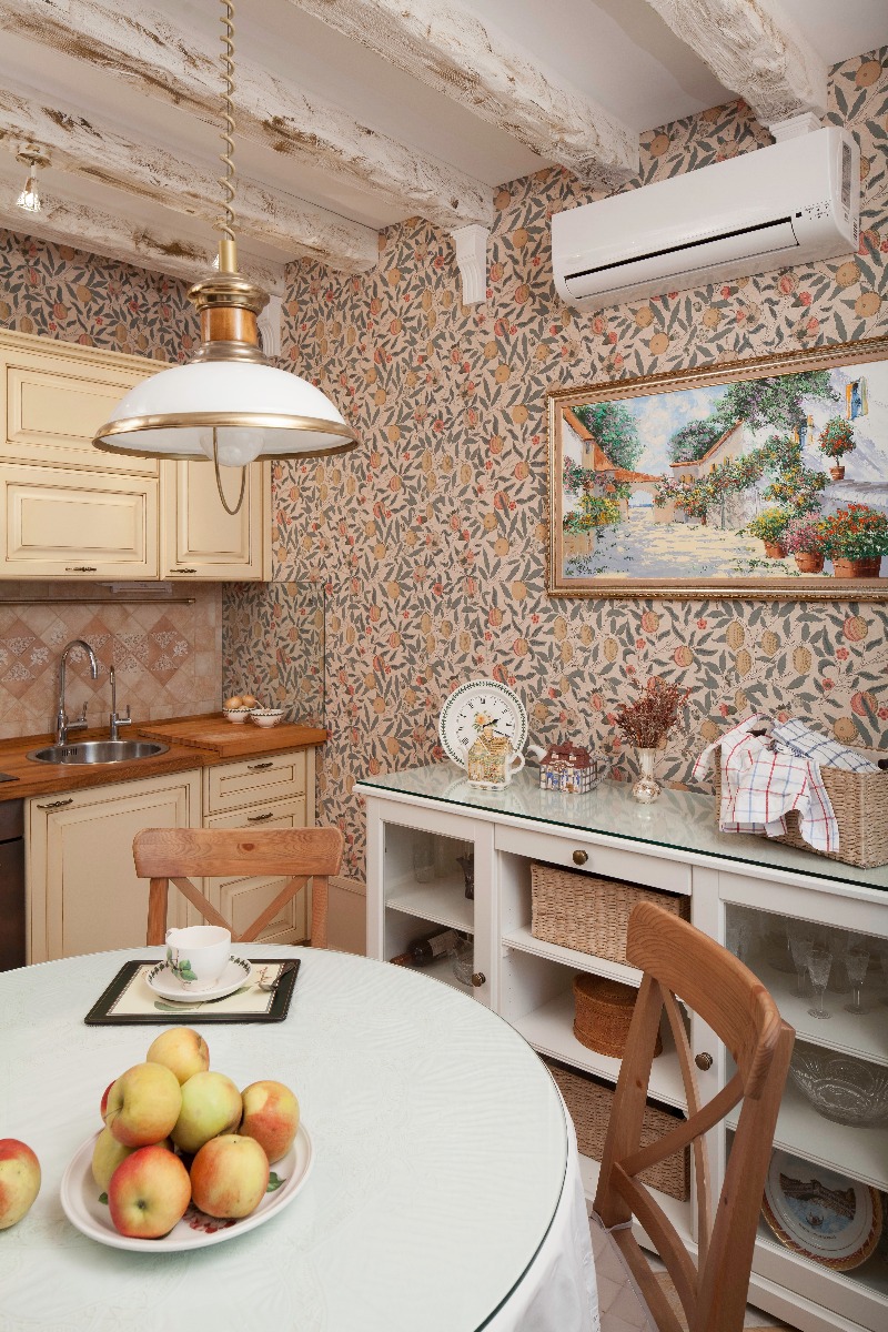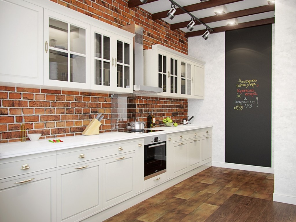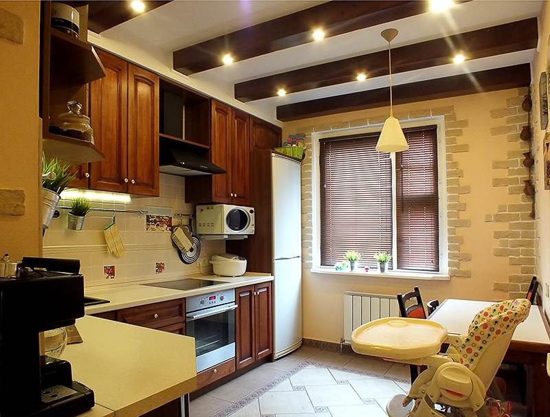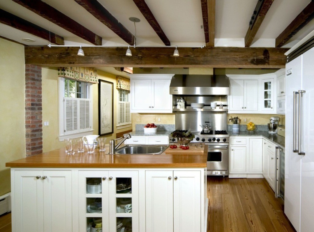 Wenn die Küche klein und weiß ist, dann in Ordnung damit das Zimmer nicht wie eine Krankenstation aussieht, kann es mit dunklen Holzbalken verdünnt werden. Schränke, die direkt an die Decke gehen, werden schön aussehen. Sie scheinen eine Fortsetzung der Strahlen zu sein.