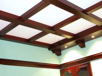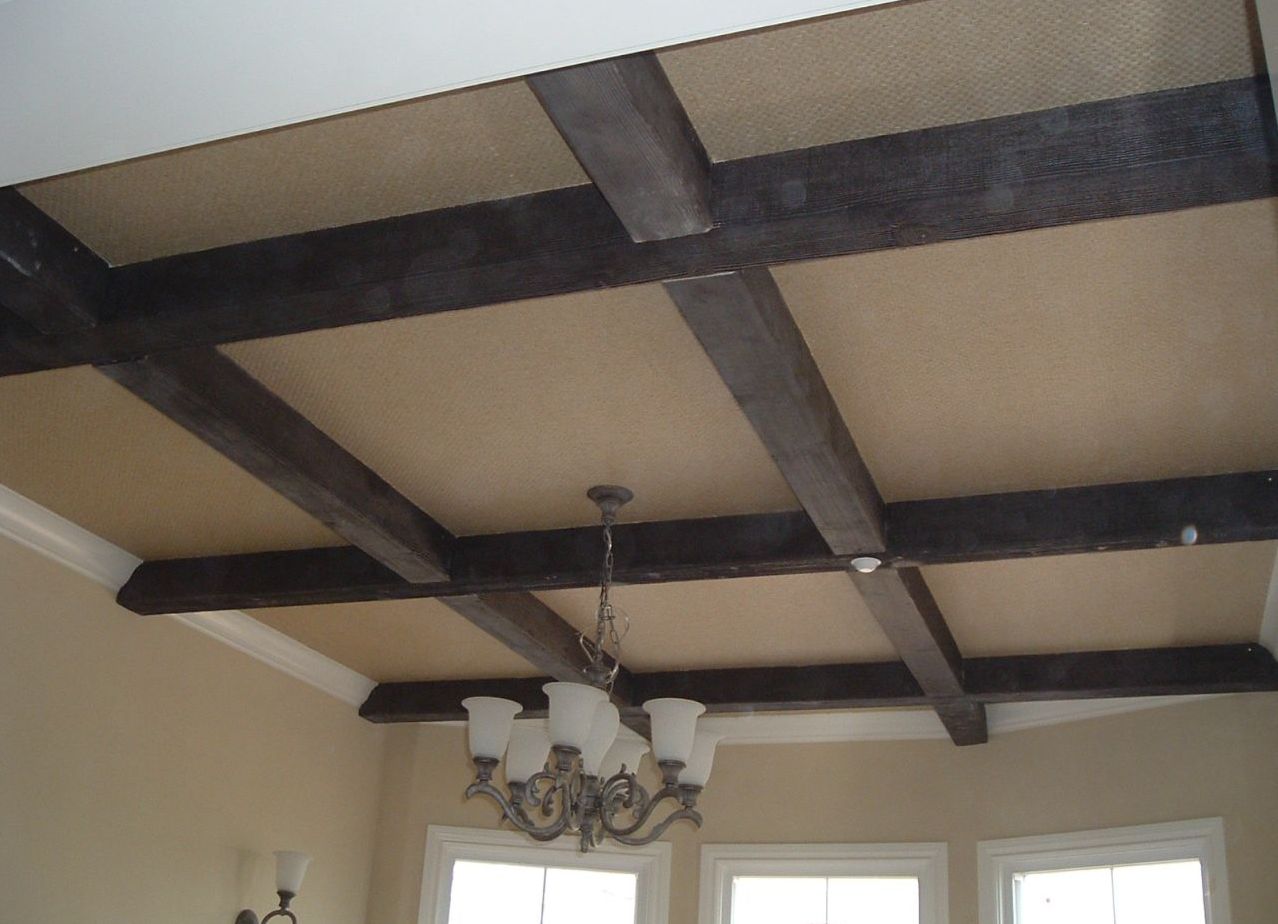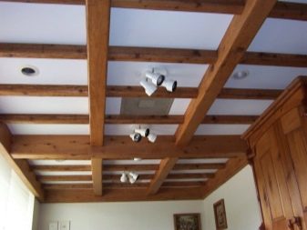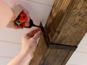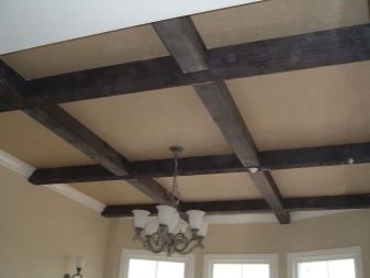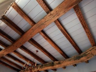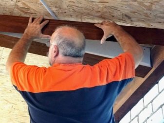 Viele Besitzer machen die Deckenbalken mit ihren eigenen Händen. Sie sind um den Umfang des Raumes herum installiert. Sie sind mit speziellen Befestigungselementen befestigt. Für die Ablage der Decke können Trockenbauplatten oder OSB-Platten verwendet werden. Machen Sie sie aus Holz oder Polyurethan.