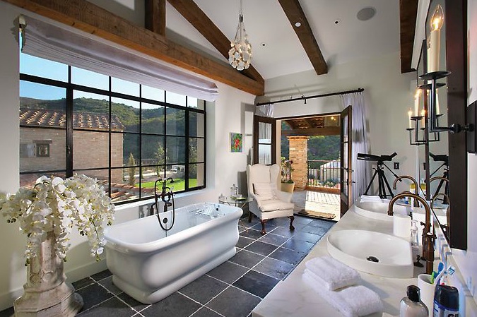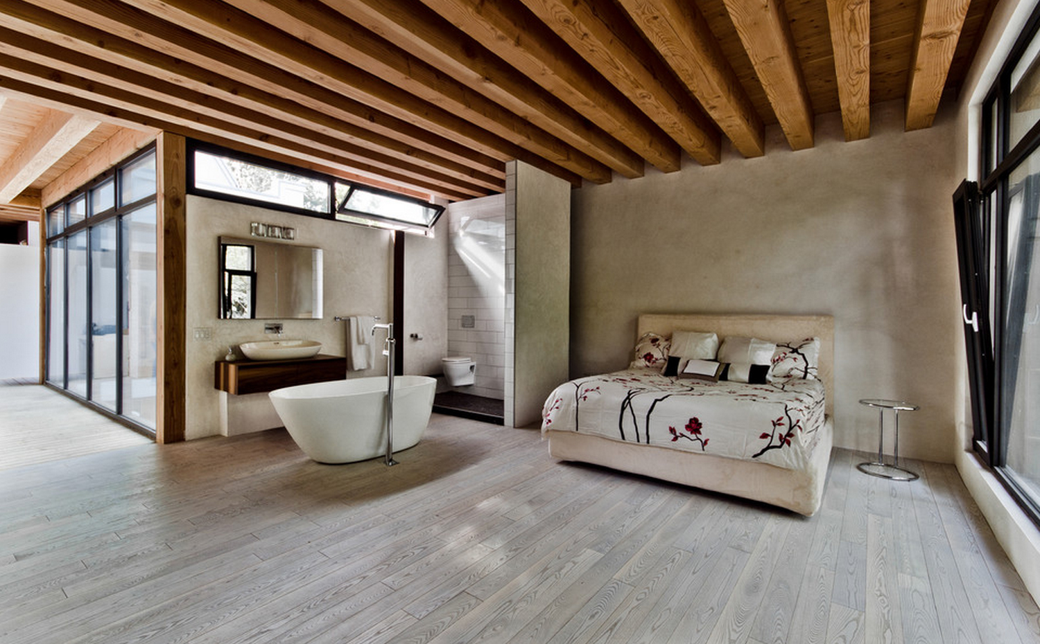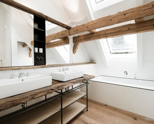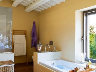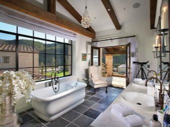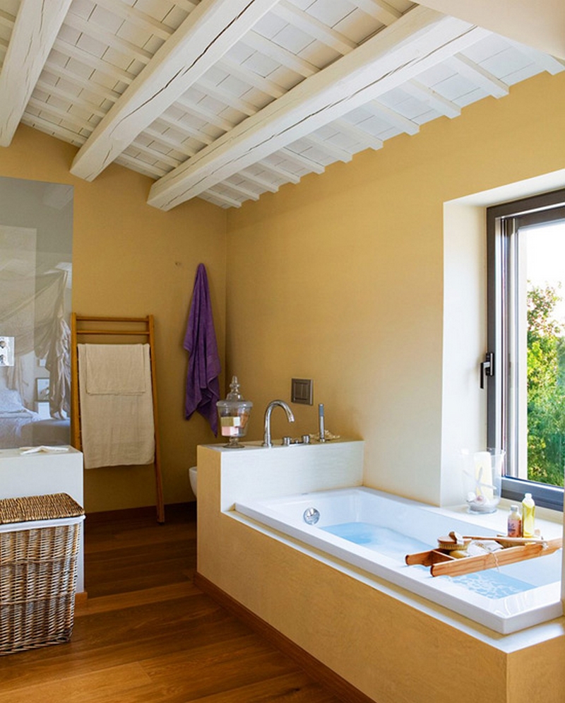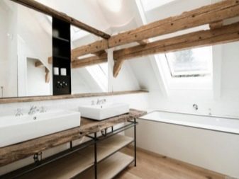 Aber in den jetzt gebauten Landhäusern Wo es eine große Fläche unter dem Badezimmer gibt und die Decken hoch sind, können Sie Balken verwenden. Es lohnt sich jedoch, sich an die hohe Luftfeuchtigkeit in einem solchen Raum zu erinnern. Deshalb Es lohnt sich, entweder Polyurethan-Träger zu verwenden oder Holz mit speziellen Substanzen zu verarbeiten.das schützt vor Feuchtigkeit.