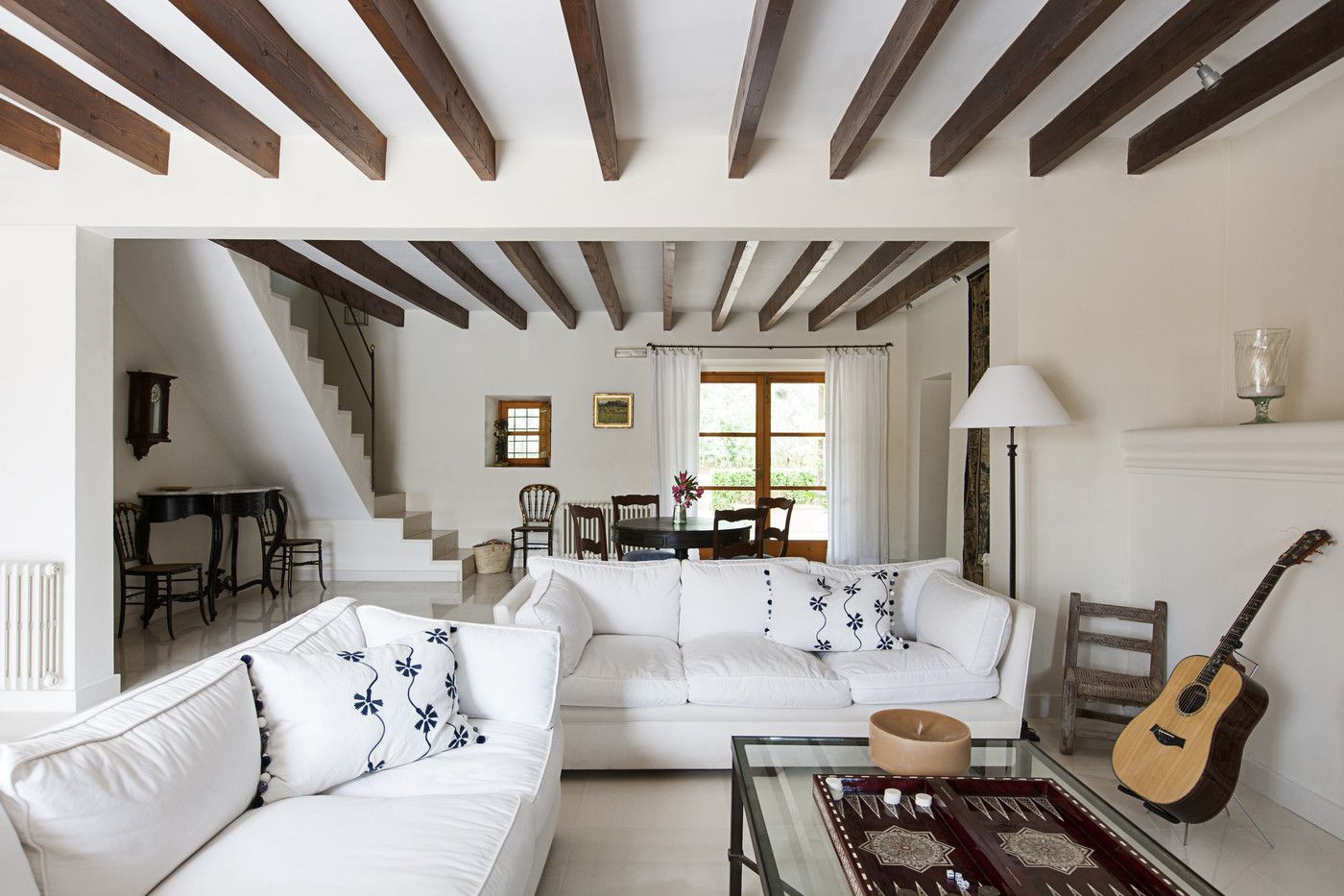 Sie können das helle Finish der Decke mit dunklen Holzbalken oder deren Nachahmung kombinieren. Wände, die mit farbigen Tapeten beklebt sind, in Harmonie mit den Deckenstrukturen, die die gleiche Farbe haben. Sehr antike Balken werden schön gegen die weißen Wände aussehen.