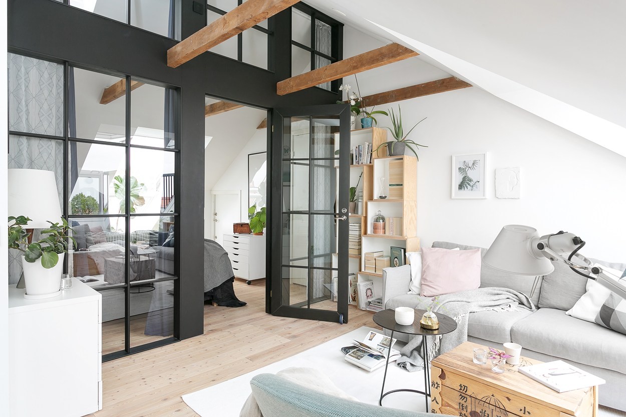 Das Hauptattribut des skandinavischen Stils sind oft nur Holzbalken an der Decke. Ihre Schattierungen sollten leicht sein. Dank dessen wirkt das Zimmer sehr geräumig und gemütlich. Es scheint, dass die Sonne selbst den Raum füllt.