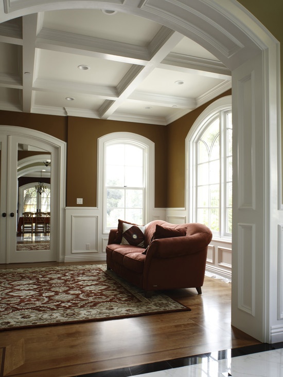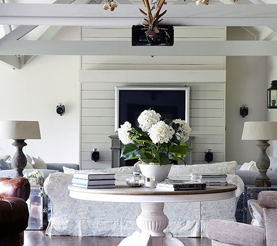 Die Decke, in der eine Balkendecke angebracht ist, verleiht dem Haus Gemütlichkeit, besonders wenn es in kontrastierenden Farben gehalten wird und ungewöhnlich gegen die monochrome Oberfläche der Decke wirkt.