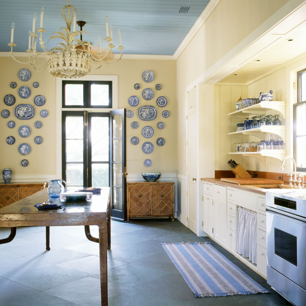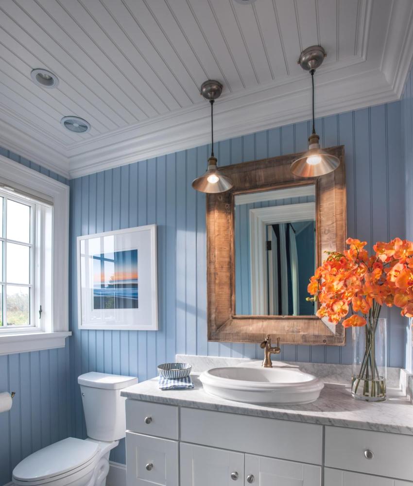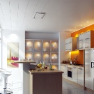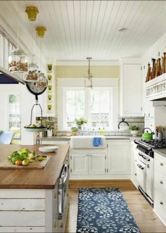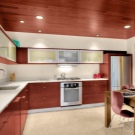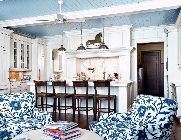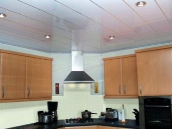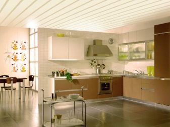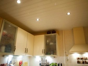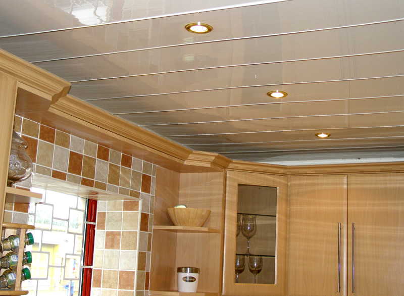 Es ist akzeptabel, eine Kombination mit wechselnden Farben zu verwenden. Die Decke aus weißem und beigefarbenem nahtlosem Streifen mit einer Breite von 250 Millimetern wird im Inneren, wo das Küchenset aus natürlichem Holz verwendet wird, originell aussehen.Die Kombination aus mehrfarbigen PVC-Platten verleiht Ihrer Einrichtung eine besondere Note und lässt Sie die Verwendung eines der billigsten Baumaterialien vergessen. Visuell erhöhen Sie die Höhe des Raumes werden Blätter in bläulichen und grünlichen Schattierungen. Solche Farblösungen tragen zu einer ruhigen und friedlichen Atmosphäre bei.