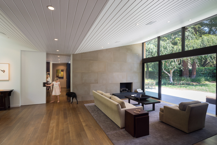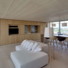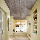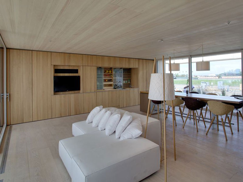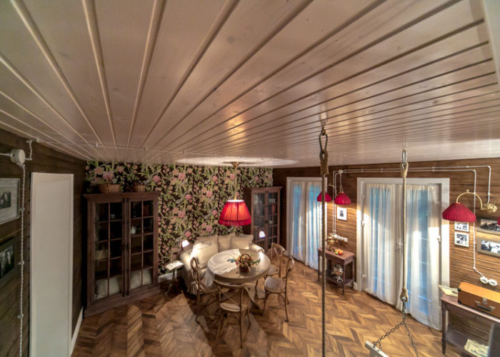Für diesen Innenraum wurden nahtlose glänzende PVC-Platten verwendet. Ummantelte Decke sieht wie eine einzelne flache Oberfläche aus. Und die glänzende reflektierende Oberfläche der Decke erzeugt die Illusion von Tiefe.