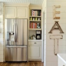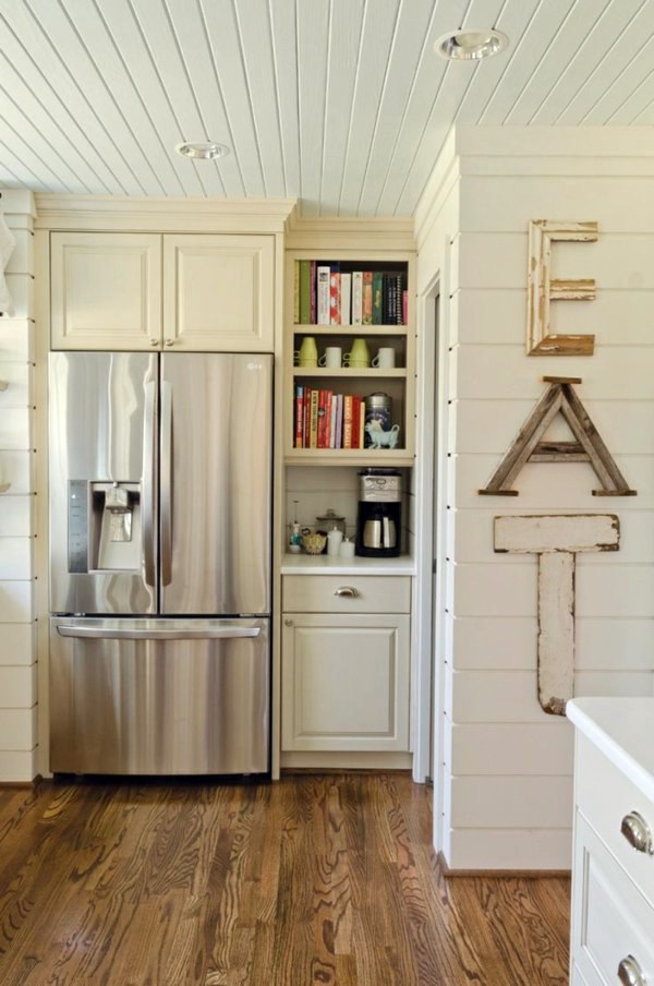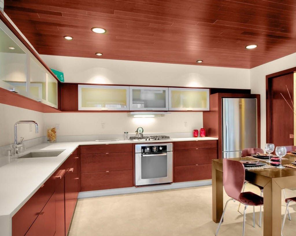 Wie wir sehen, trägt die Verwendung von Kunststoffpaneelen unter der Holzstruktur zur Atmosphäre der Küche in Gemütlichkeit und Wärme bei. Und die eingebauten Querträger gaben der Decke eine natürliche Auskleidung.